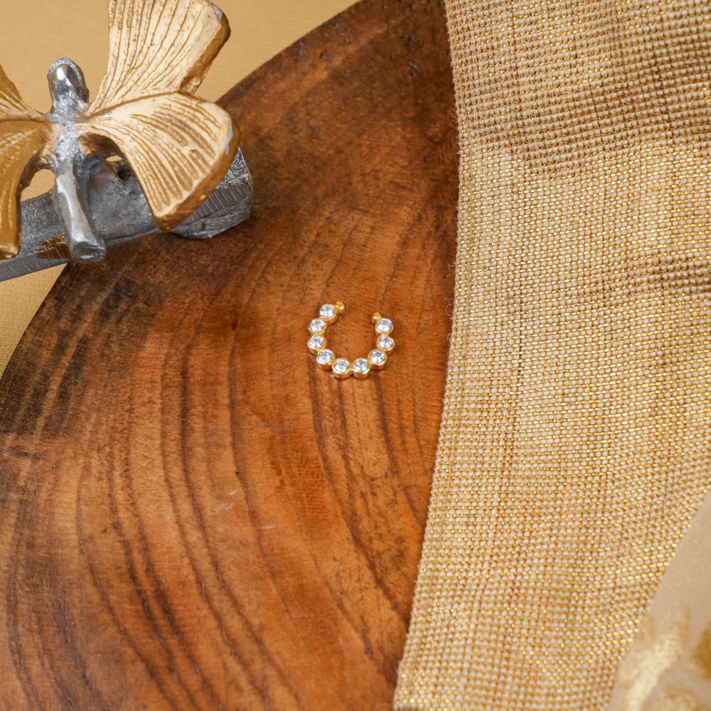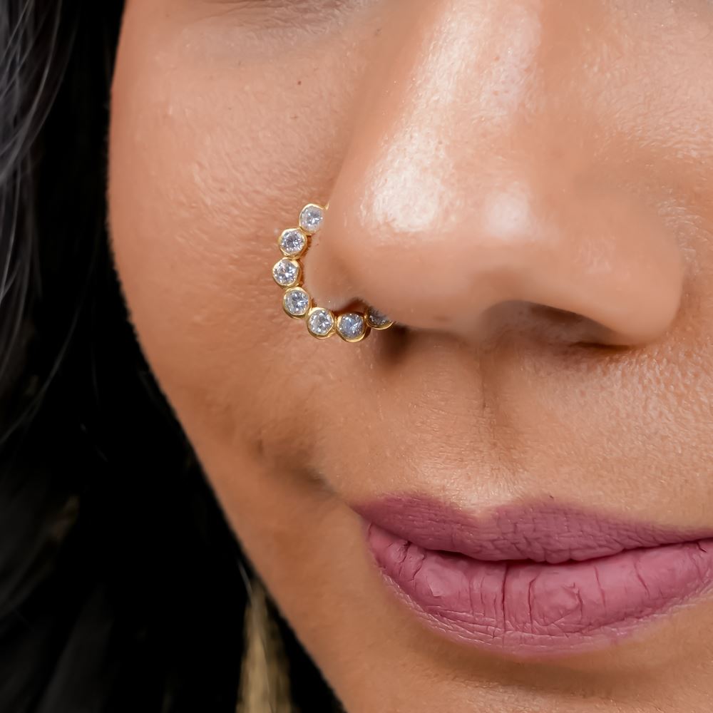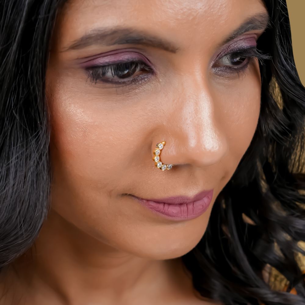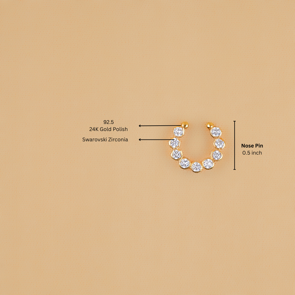 Enhance your elegance with this exquisite nose ring, meticulously crafted in 92.5 silver and adorned with brilliant Swarovski Zirconia. Designed for effortless wear, this delicate piece adds a touch of timeless charm, making it the perfect accessory for your most cherished traditional occasions. Let its refined sparkle accentuate your grace with understated sophistication.