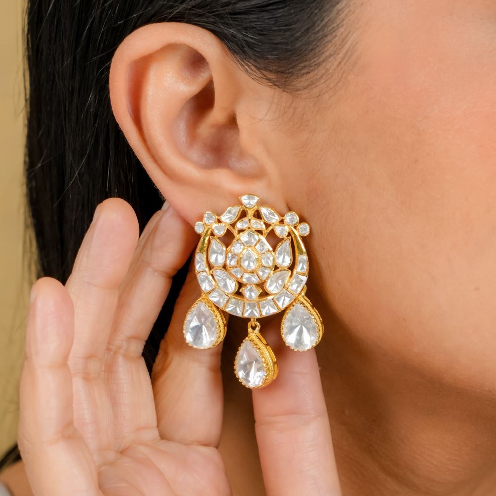 This earring is an elegant personification of moissanite polki. The artisans have put tremendous effort into creating this timeless allure, which is perfect for matching with your contemporary wear.