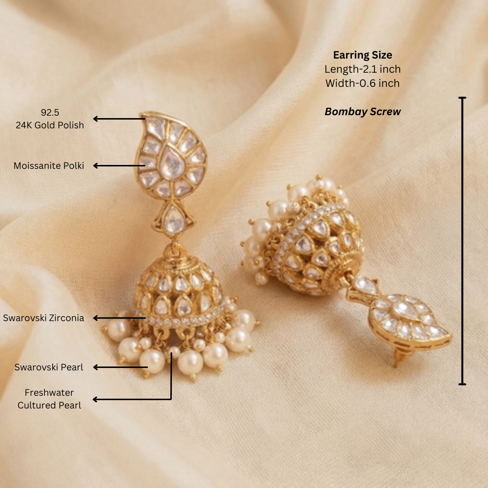 Add a timeless touch of elegance with these beautifully crafted mango jhumki earrings. Designed in a classic teardrop (mango) silhouette, these earrings feature dazzling moissanite polki stones set in a 92.5 silver base with rich 24K gold polish. The intricately detailed dome is adorned with sparkling Swarovski zirconia, while the graceful drop of Swarovski pearls and freshwater cultured pearls adds movement and charm. Finished with a secure Bombay screw closure, these statement earrings are perfect for weddings, festive occasions, and traditional celebrations.