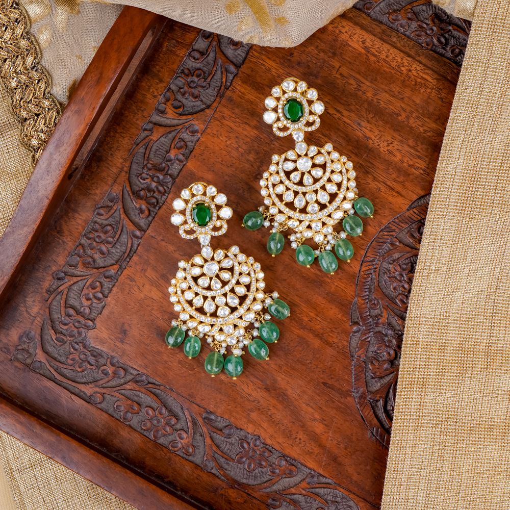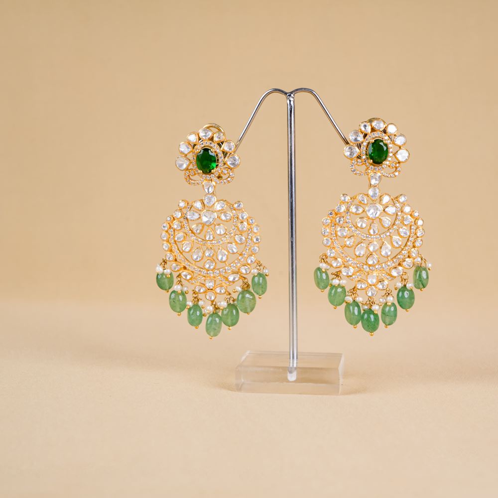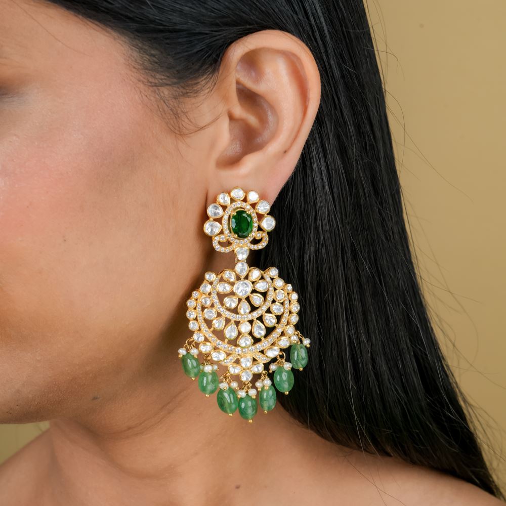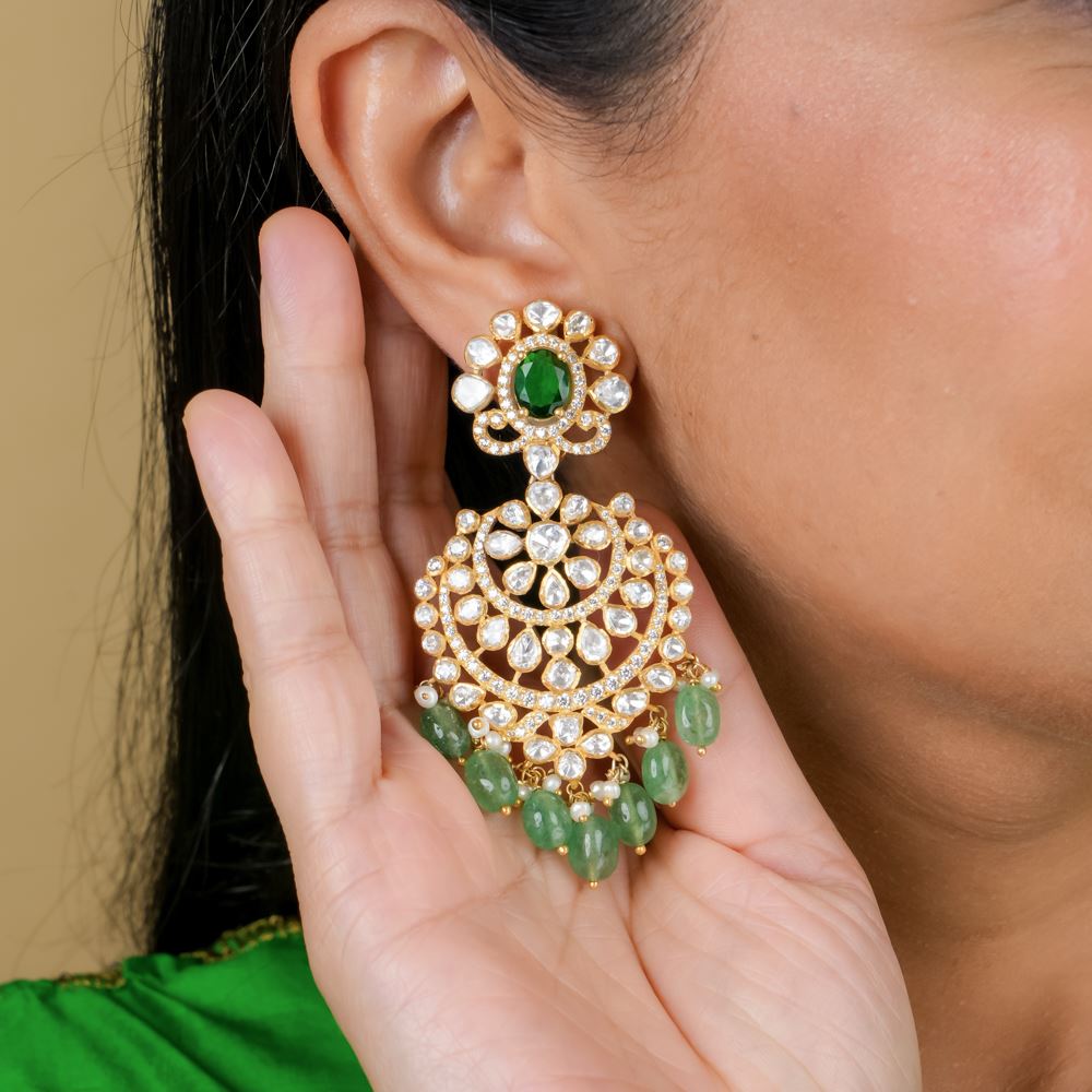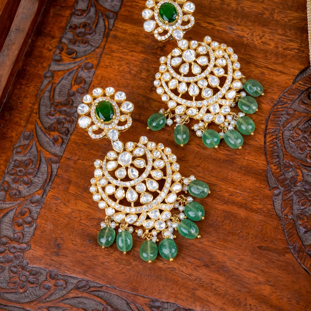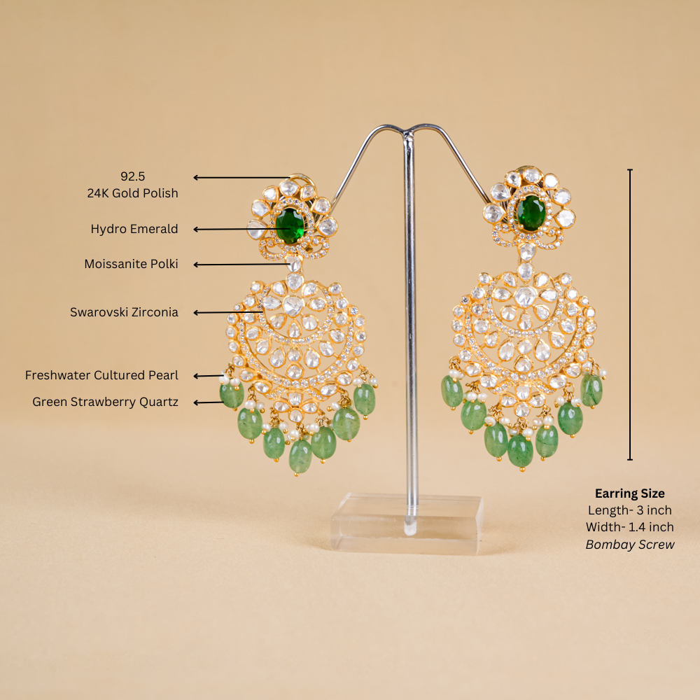 Stones: Green Strawberry Quartz, Hydro Emerald, Moissanite Polki, Freshwater Cultured Pearls, Swarovski Zirconia