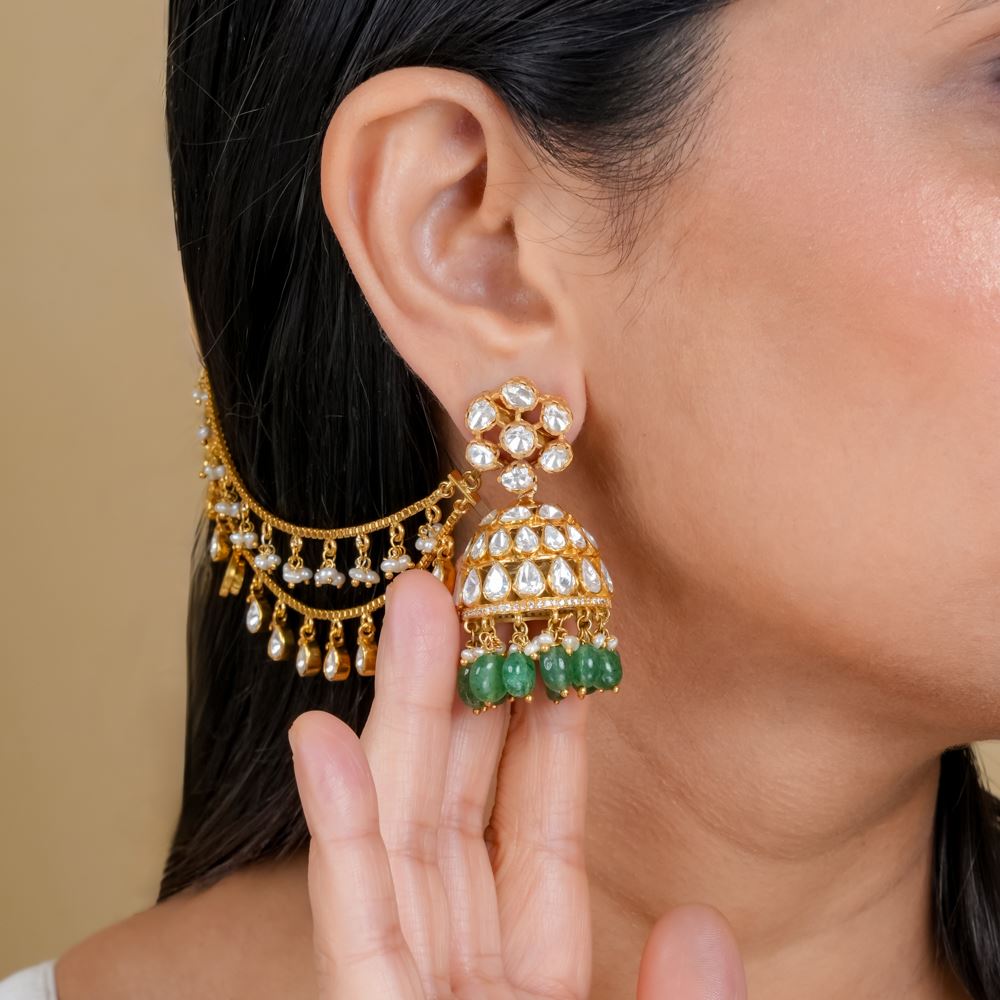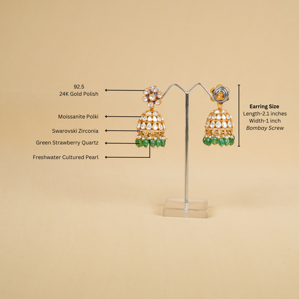 This floral moissanite polki jhumki will leave you in awe, exuding timeless elegance. The delicate beauty of green strawberry quartz Drops paired with the lustrous freshwater cultured pearl drops elevate the design, adding a regal charm that’s perfect for any special occasion. We envision this stunning earring as the ideal choice for weddings and festive celebrations, effortlessly capturing the essence of grandeur and grace.