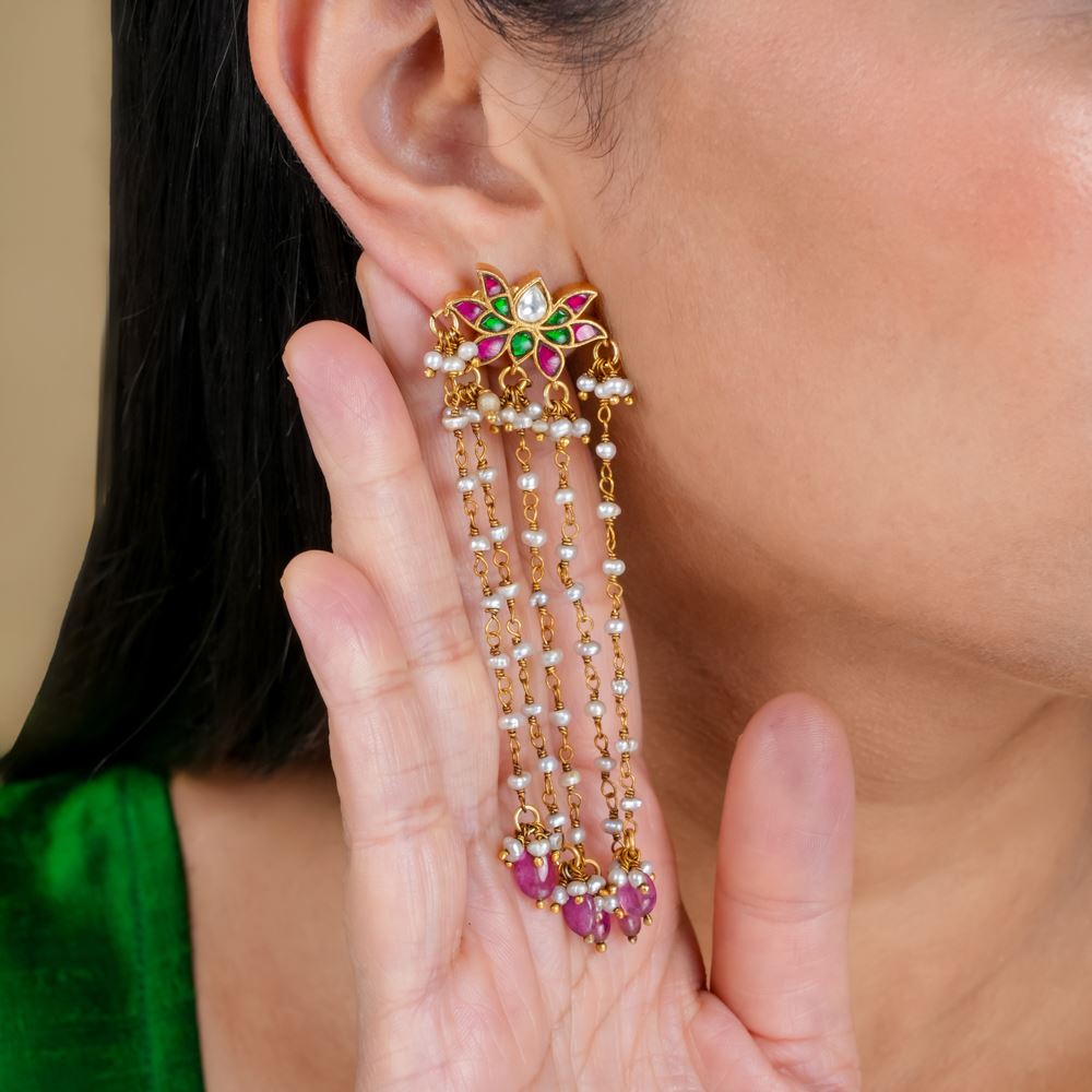 Indulge in the exquisite allure of these stunning Kundan danglers, designed for true jewellery aficionados. Their unparalleled beauty catches the eye, featuring five elegant strands of shimmering freshwater cultured pearls that evoke a timeless elegance. Adorned with natural ruby drops, these earrings are a perfect blend of classic charm and contemporary style, making them an exceptional addition to any jewelry collection.