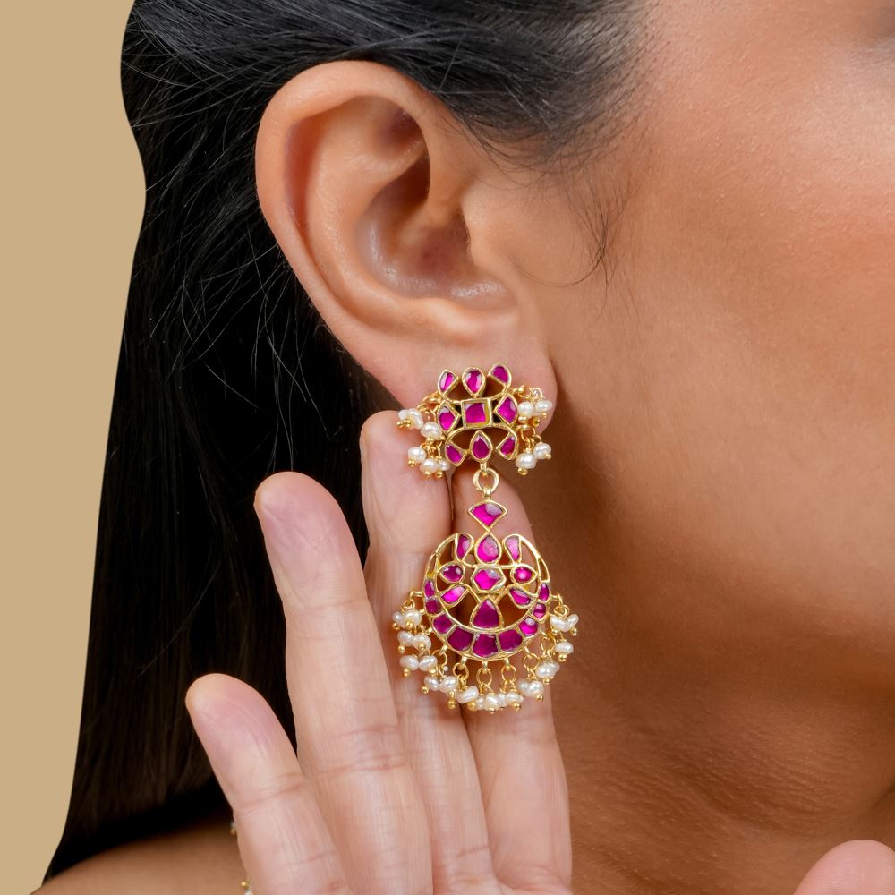 Discover the grace of these superb earrings, carefully handmade from 92.5 silver. Each piece highlights detailed features and charming Kundan patterns that draw influence from the loveliness of nature.