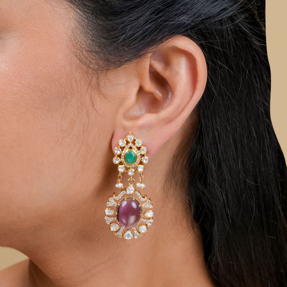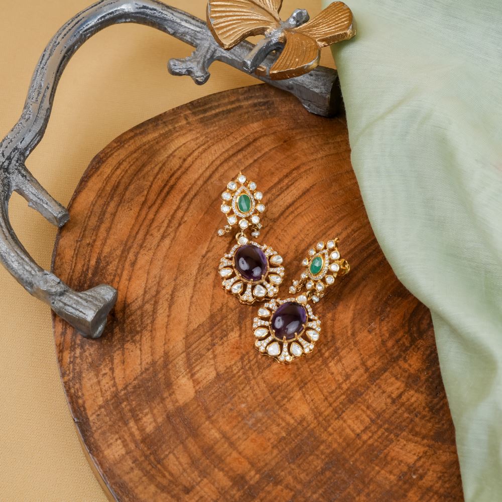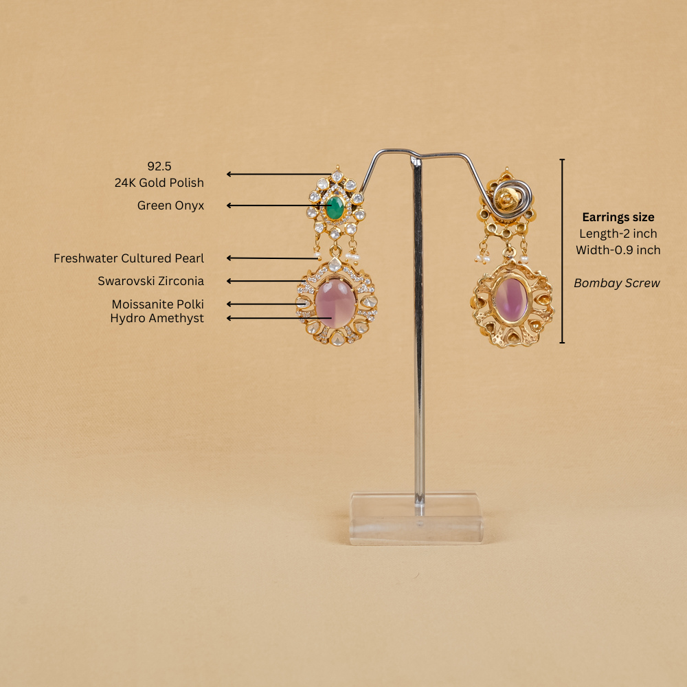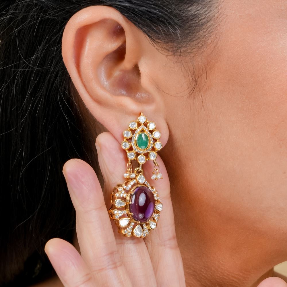 Indulge in the enchanting beauty of these earrings, where the rich, violet hues of amethyst and green onyx harmonise with the shimmering moissanite polki and Swarovski zirconia. Expertly crafted, the moissanite polki offers a timeless sparkle, while the Swarovski zirconia adds a dazzling modern touch, all framing the captivating depth of the amethyst centrepiece. Perfect for adding a pop of colour and elegance to any outfit, these earrings effortlessly elevate your style.