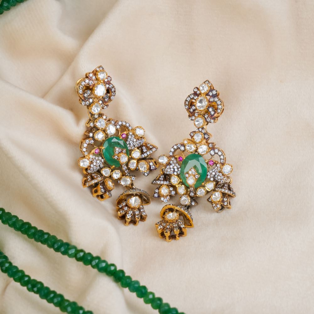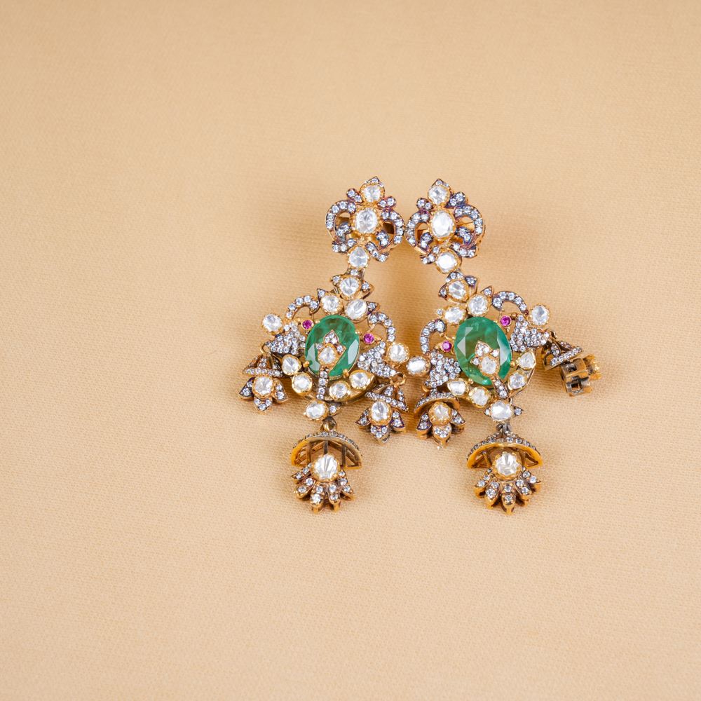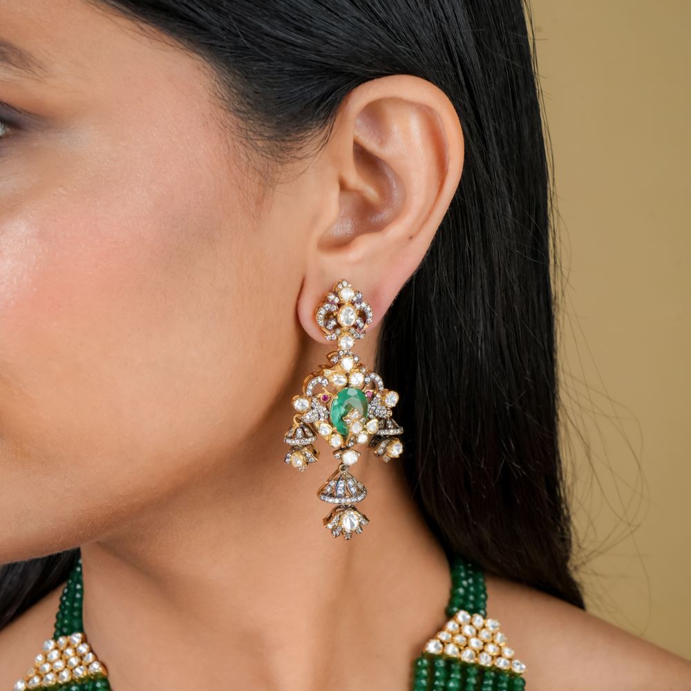 Crafted with unparalleled artistry, these enchanting earrings see moissanite polki and hydro emerald, all set in silver 92.5. This earring epitomises sophistication and style destined to make a statement wherever you go. Perfectly suited for a myriad of occasions, these earrings are a must-have for every jewellery collection.