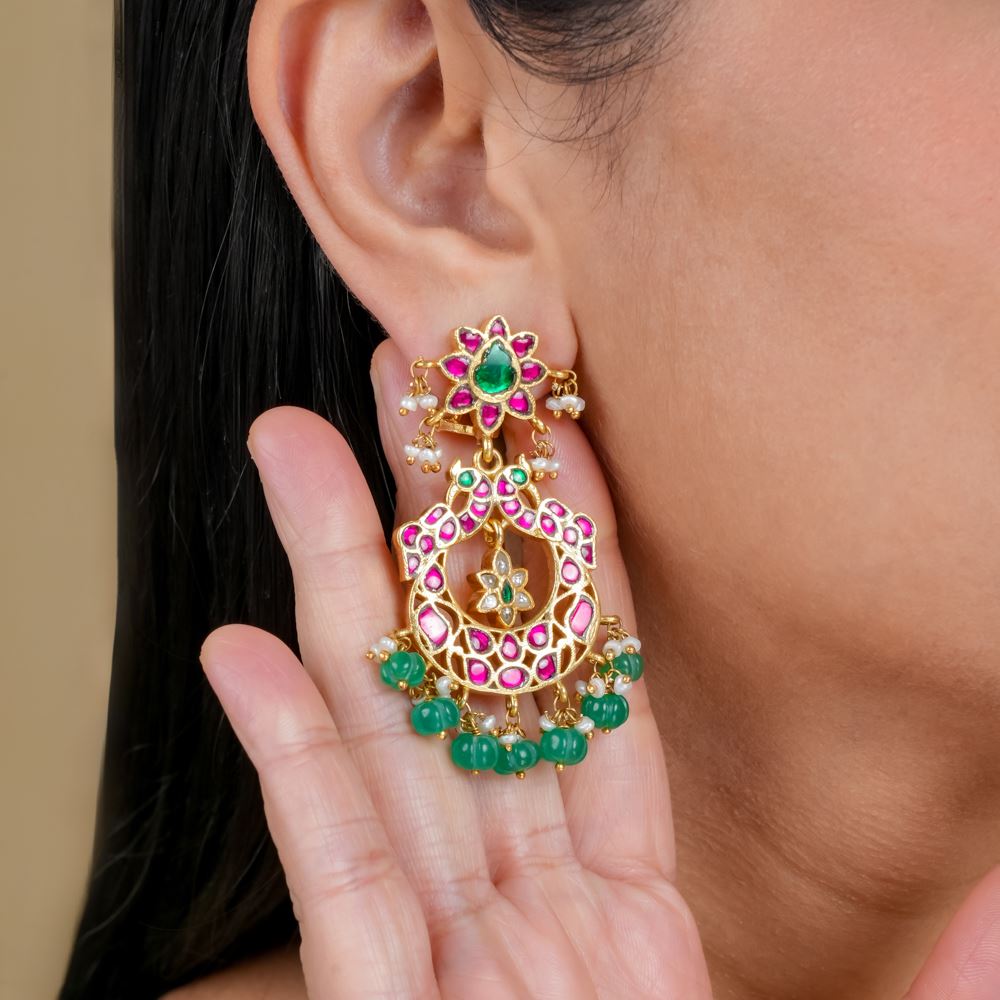 These stunning earrings, handcrafted from pure silver, add dazzling elegance without weighing down your ears or your wallet. Featuring Green onyx along with freshwater cultured pearls and Kundan work, this earring will look stunning for traditional attire.