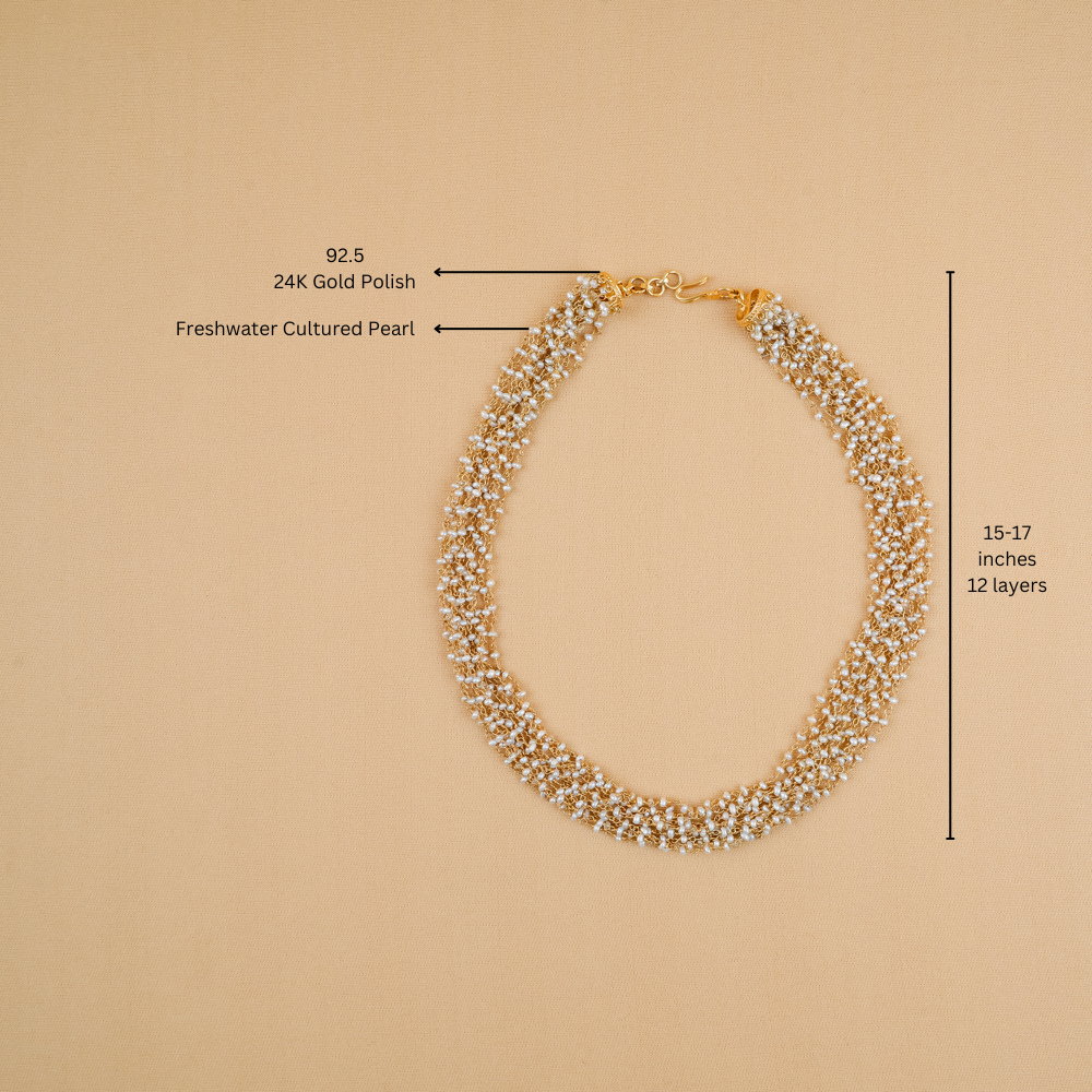 These 12 layers of knotted freshwater cultured pearls radiate elegance and exude a unique charm that captivates the eye. Each layer is handcrafted by the karigars of Jaipur, making it a timeless addition to any jewellery collection. Whether you're dressing up for a special occasion or looking to elevate your outfit, these pearls add sophistication and grace to any ensemble.