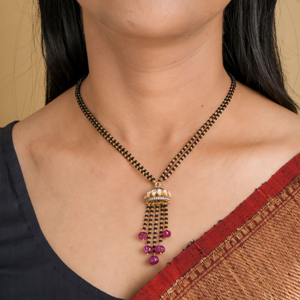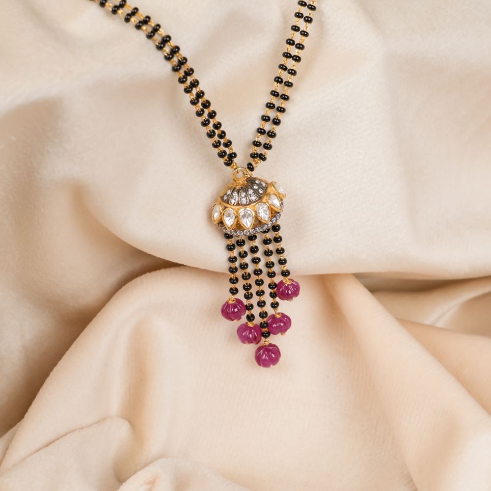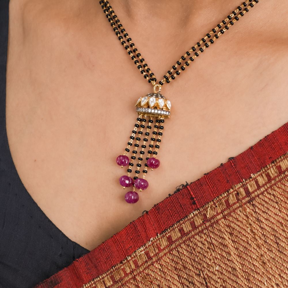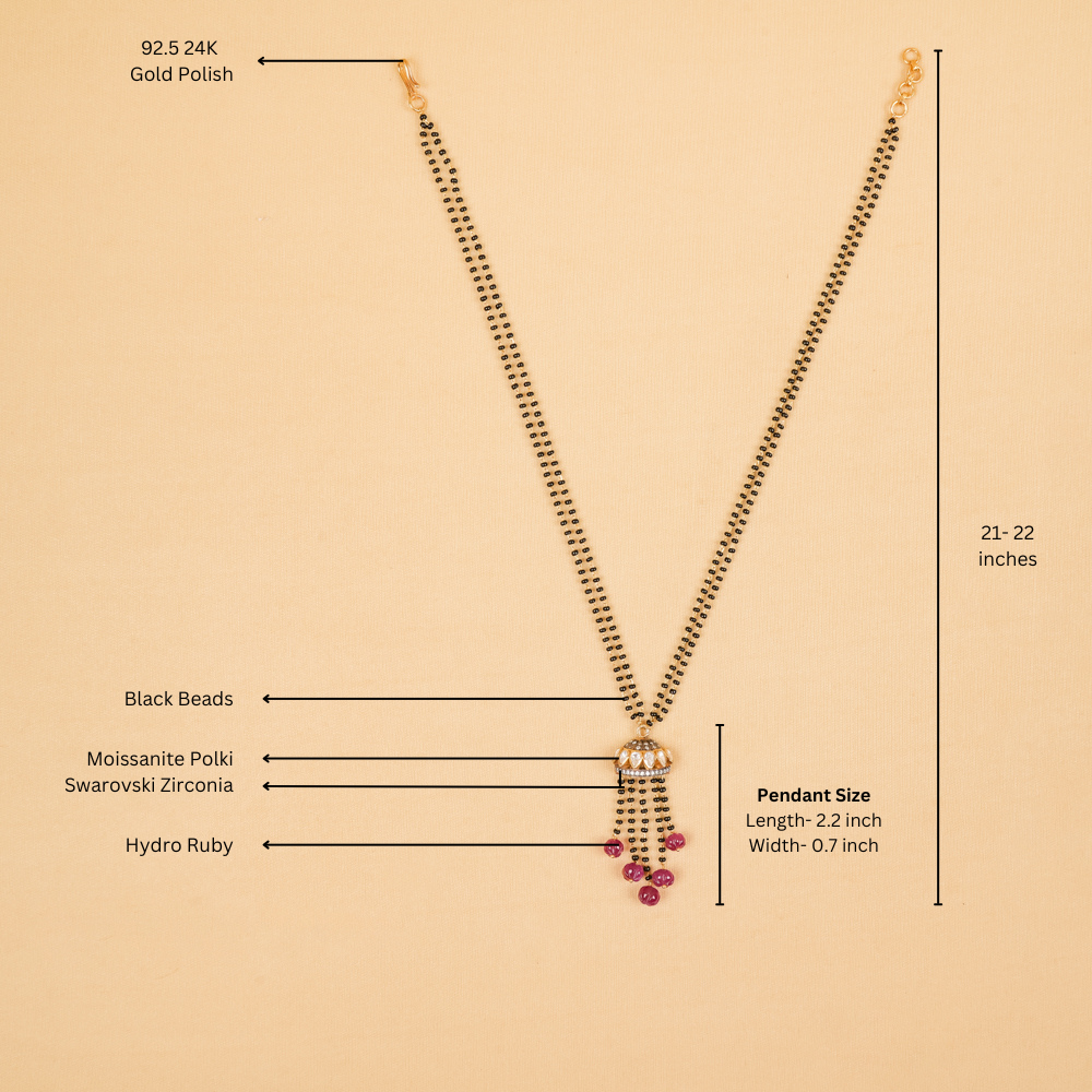 Complement your elegance with our Mangalsutra, the perfect touch for your Chiffon saree or any light saree. This delicate piece, crafted with a beautiful fusion of black beads, Hydro Ruby, Moissanite Polki, and Swarovski Zirconia stones, adds a touch of sophistication without overwhelming your look. On top of it, the half-jhumki takes centerstage completing the whole look.
