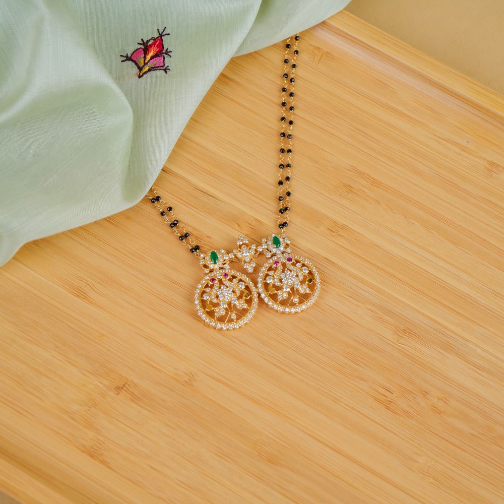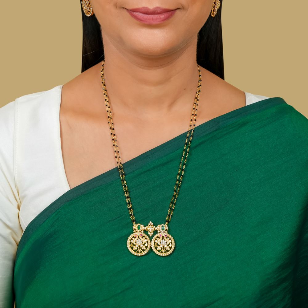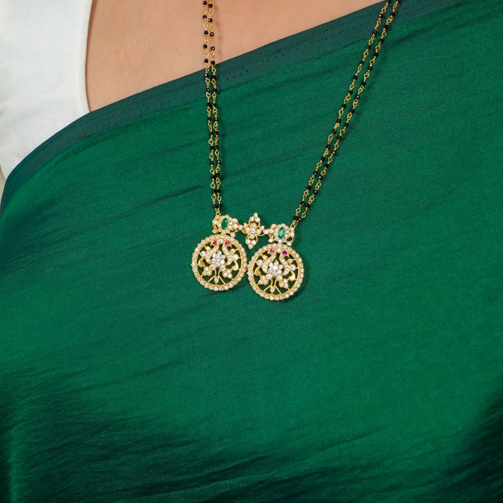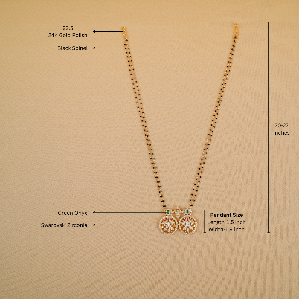 Elevate your elegance with this stunning 2-layer black spinel knotted necklace with dual bottu pendant. Meticulously handcrafted in silver 92.5, the dual bottu pendant is intricately designed and embellished with swarovski zirconia stones that shimmer with brilliance similar to diamonds. The pendant enhances the overall charm of the piece, making it perfect for festive occasions, weddings, or evening wear.