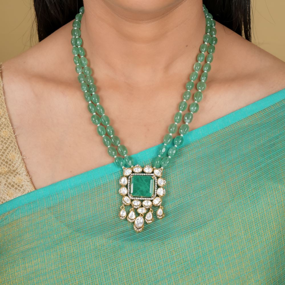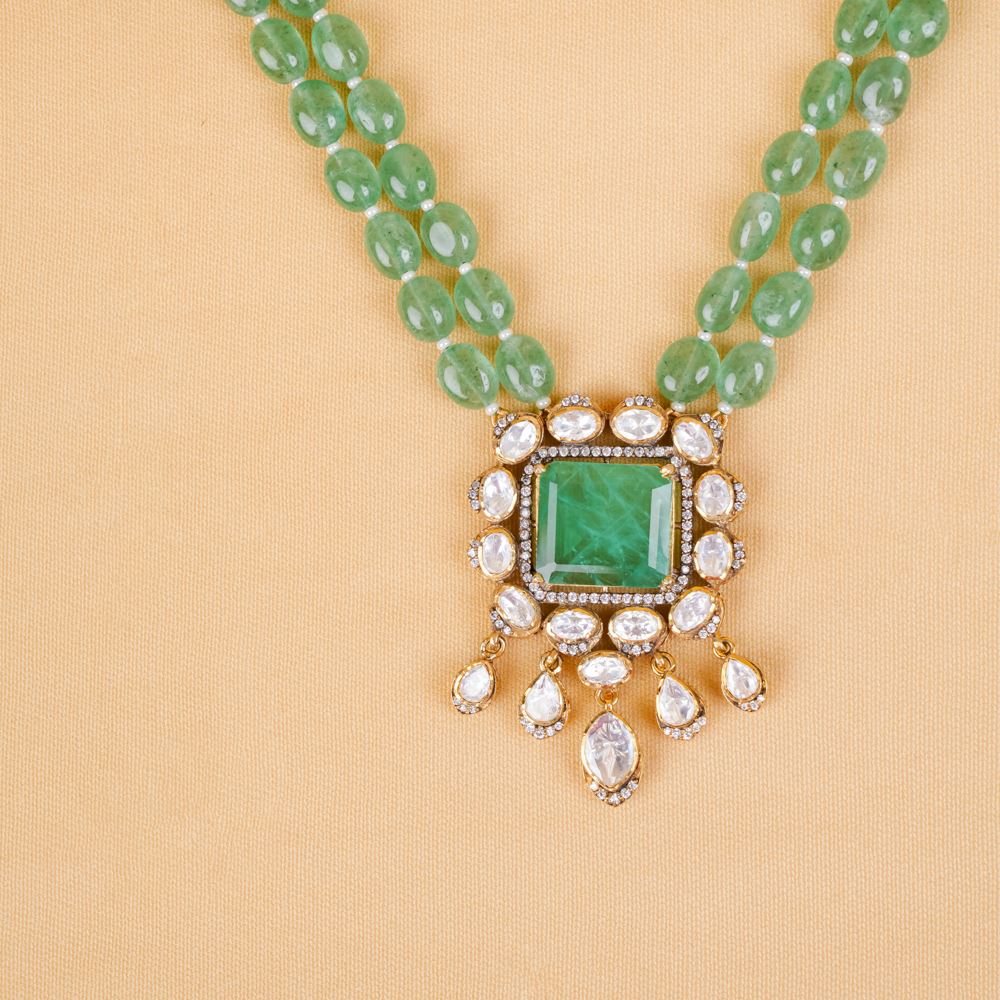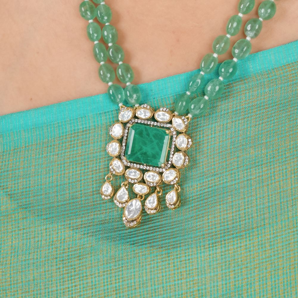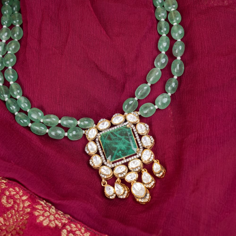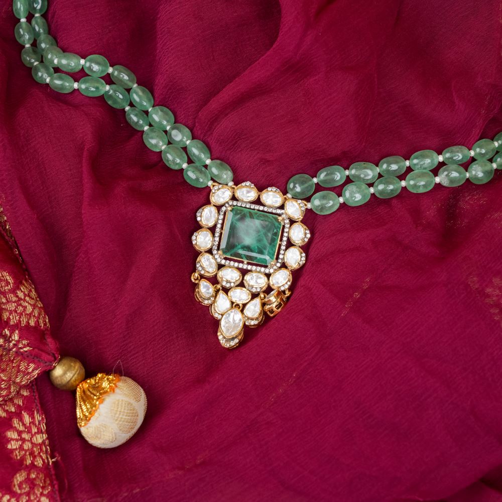 This resplendent necklace is a contemporary reinterpretation using quality gemstones like green strawberry quartz, moissanite polki, Swarovski zirconia, and hydro emerald. It's a toast to your uniqueness, which can be worn for late-night formal events, award functions, or simply to a reception party.