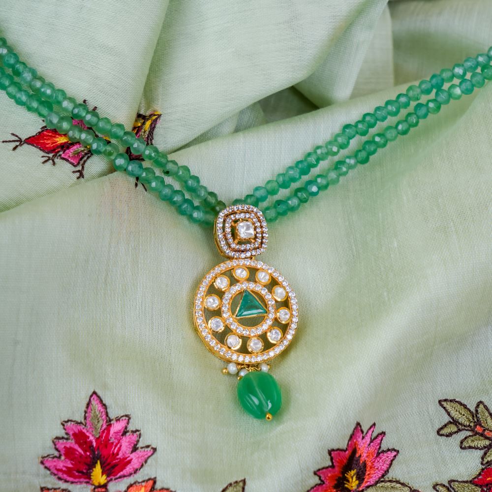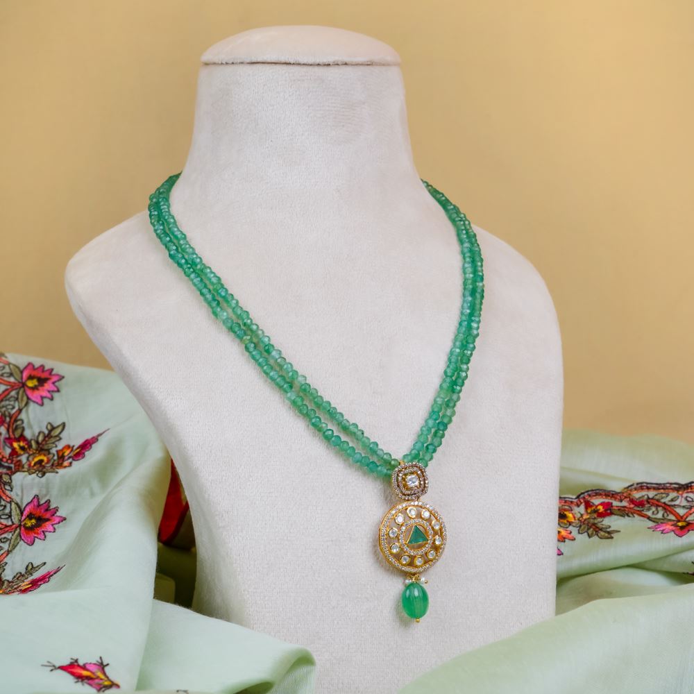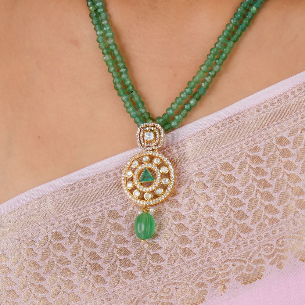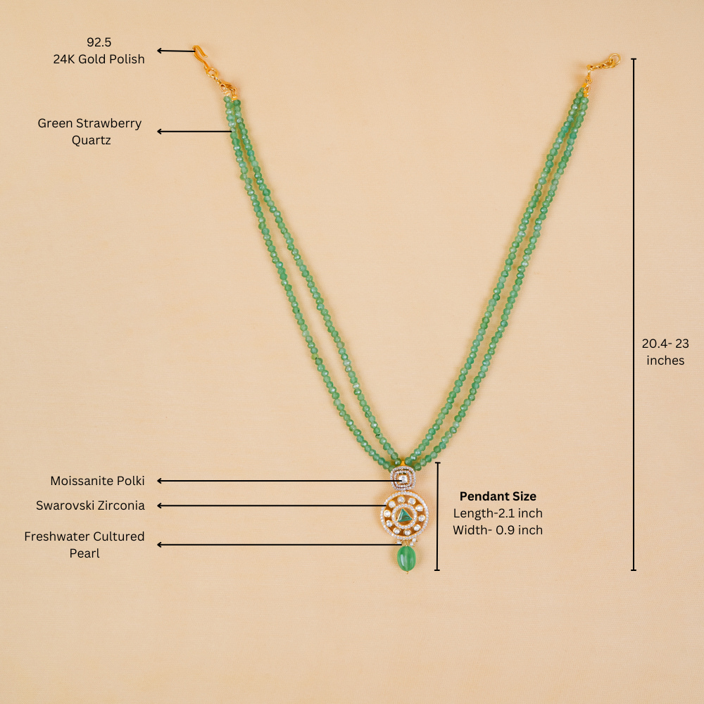 Check out this stunning Green strawberry quartz necklace! It's a perfect way to add glamour to your style. This intricately beaded necklace is made with silver 92.5 and features moissanite Polki, freshwater cultured pearls, and Swarovski zirconia stones. It's a true showstopper!