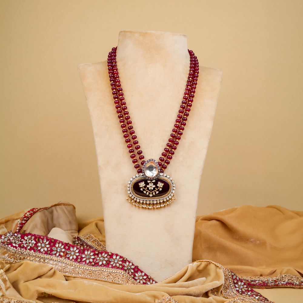 Two layers of radiant quartz cascade into a captivating pendant, a true testament to our daring craftsmanship. We proudly call this design Jodhpur Work, where every delicate detail—especially the intricate floral motif at the center—reflects the artistry of time-honed skills. Embellished with the brilliance of Swarovski zirconia, moissanite polki, and lustrous freshwater cultured pearls, this pendant exudes bold elegance. It’s more than just jewelry; it’s an exquisite statement piece that will make you feel truly sophisticated and radiant.