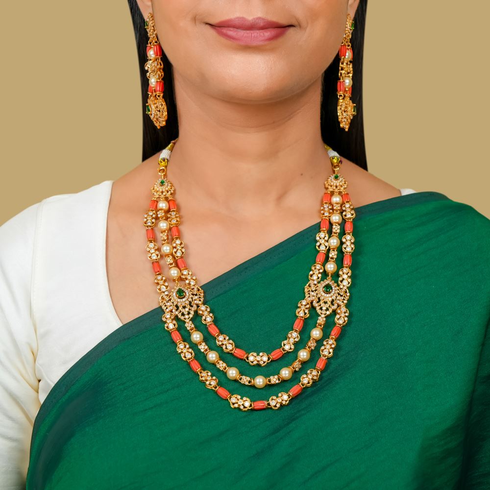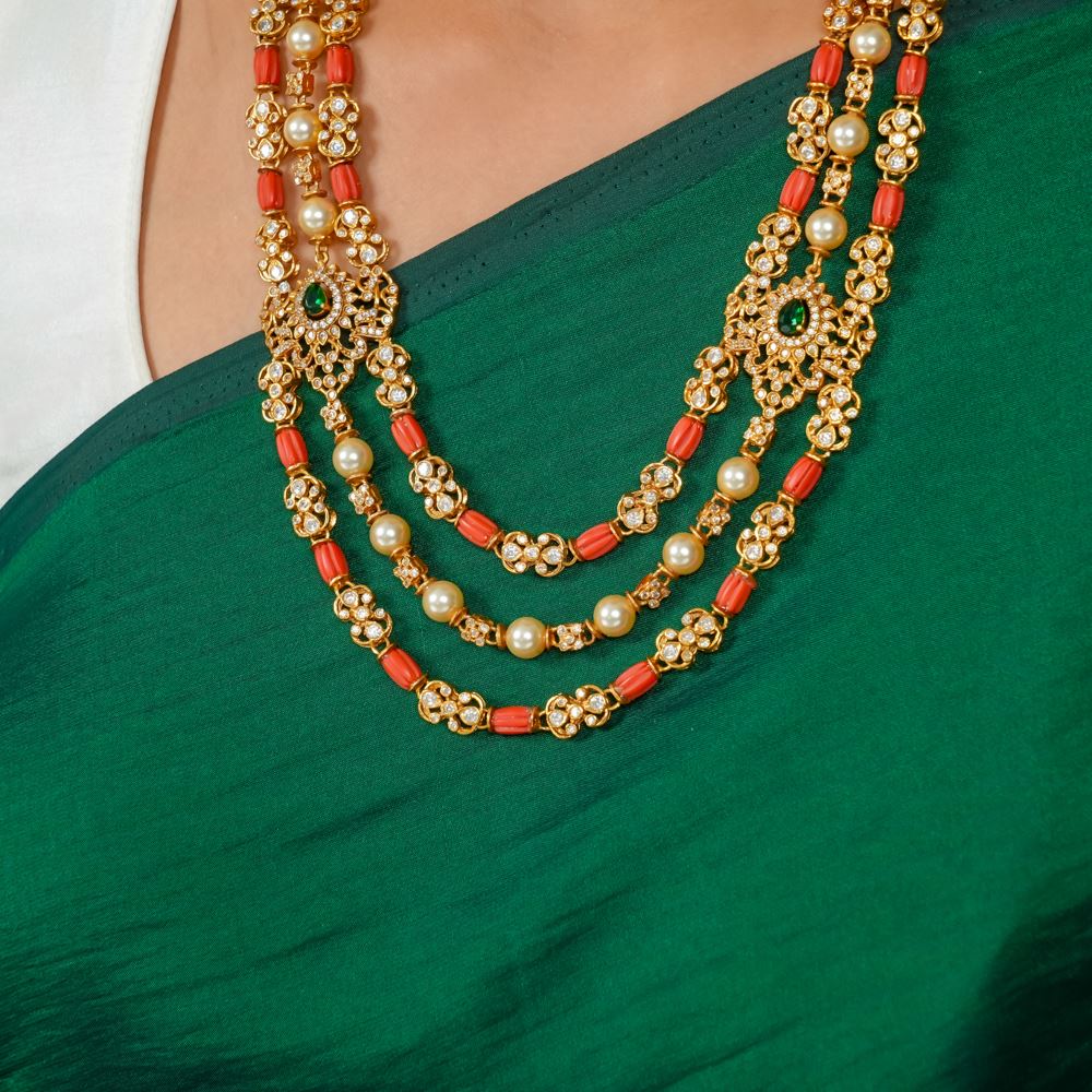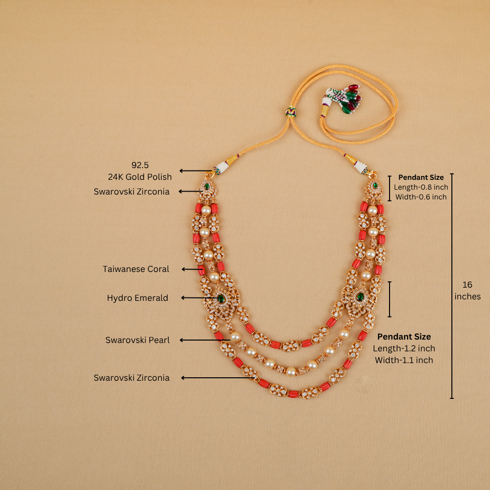 This 3 layer coral necklace is beautifully crafted with coral beads, Swarovski pearls, hydro emerald, and Swarovski zirconia. This statement necklace is is handcrafted in 92.5 silver with 24K gold polish which adds a rich ethnic charm, perfect for festive and wedding wear.