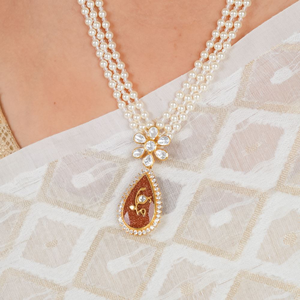 Picture the exquisite beauty of three layers of shimmering Swarovski pearls accentuating a stunning orange sandstone pendant, embellished with our distinct Jodhpur craftsmanship on your favourite traditional ensemble. This beautiful piece features a floral moissanite polki exuding a natural and luxurious allure.