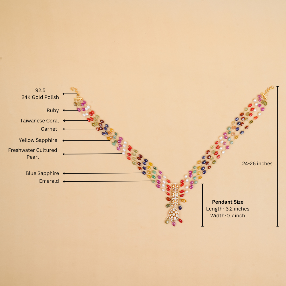 Drape yourself in a bold-coloured saree and adorn your neck with a stunning four-layer natural navaratna necklace. The intricate floral moissanite polki design in the pendant adds a touch of elegance, enhancing the beauty of this necklace. Embrace your day with this lively and colourful piece, and let it reflect your vibrant spirit.