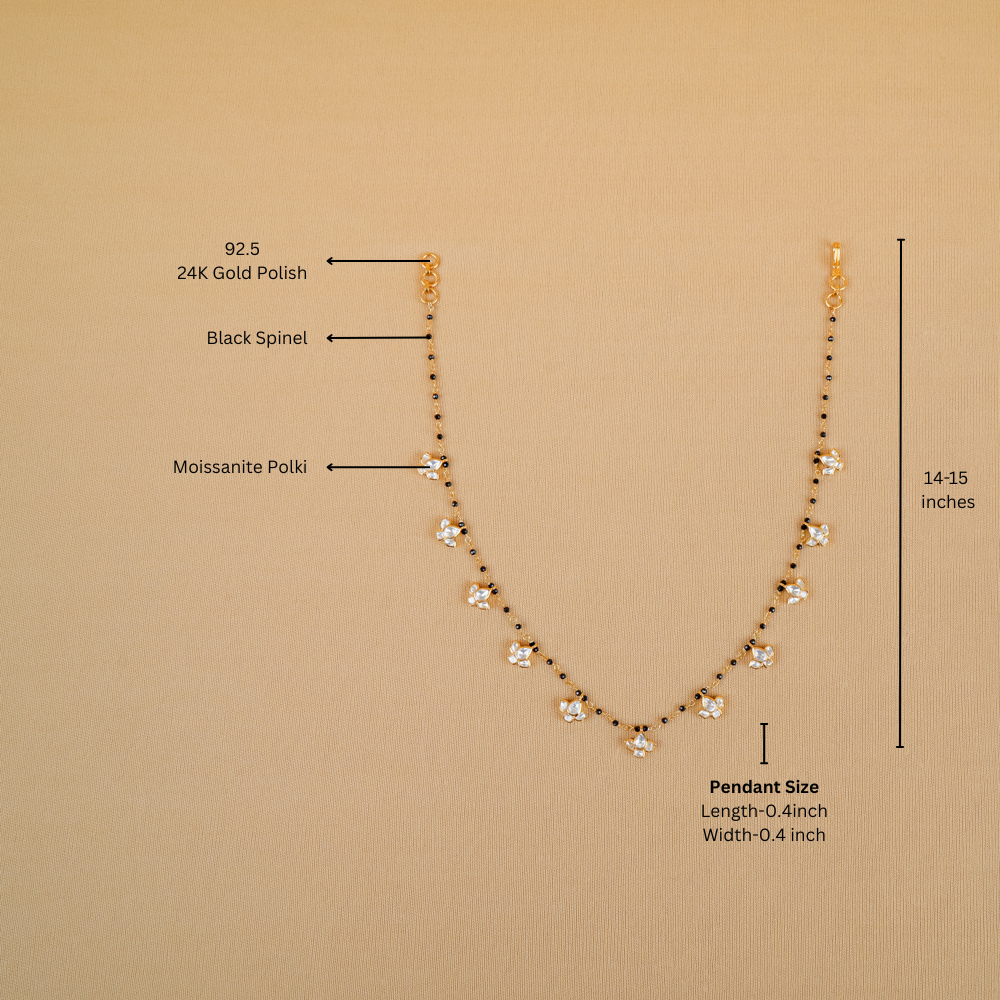A refined expression of elegance, this black spinel necklace is meticulously hand-knotted and set in 92.5 silver. The deep, faceted black spinel beads create a striking contrast against the brilliance of the lotus moissanite polki pendant, adding a touch of timeless sparkle.