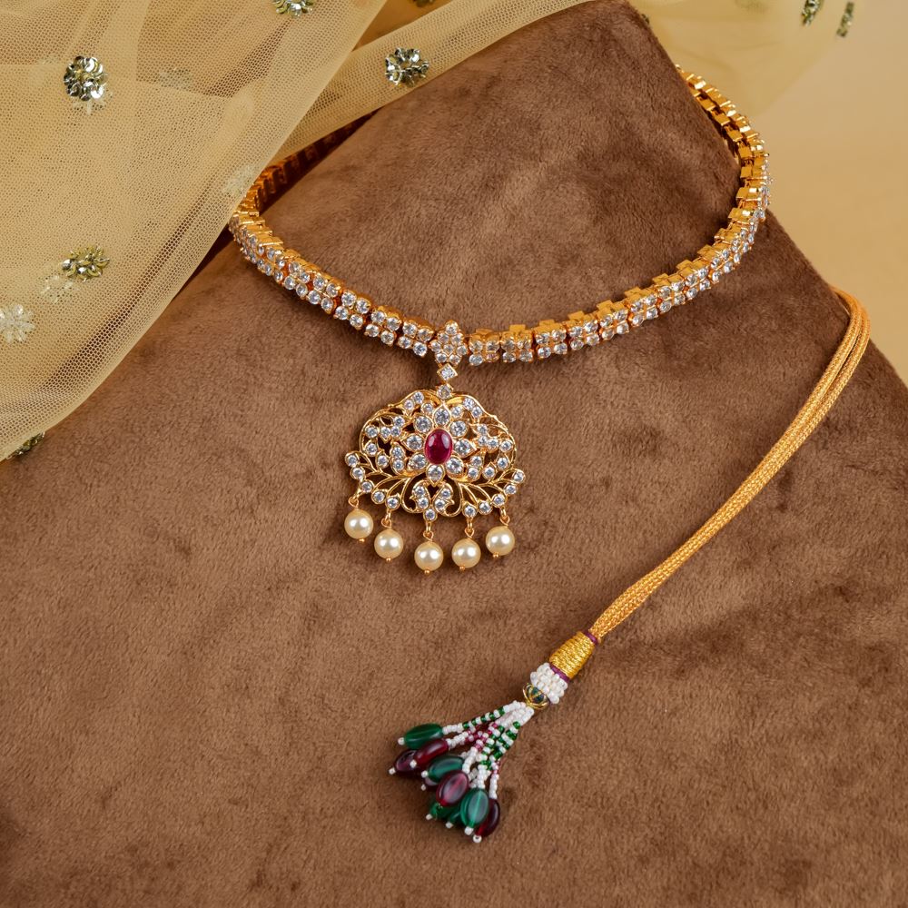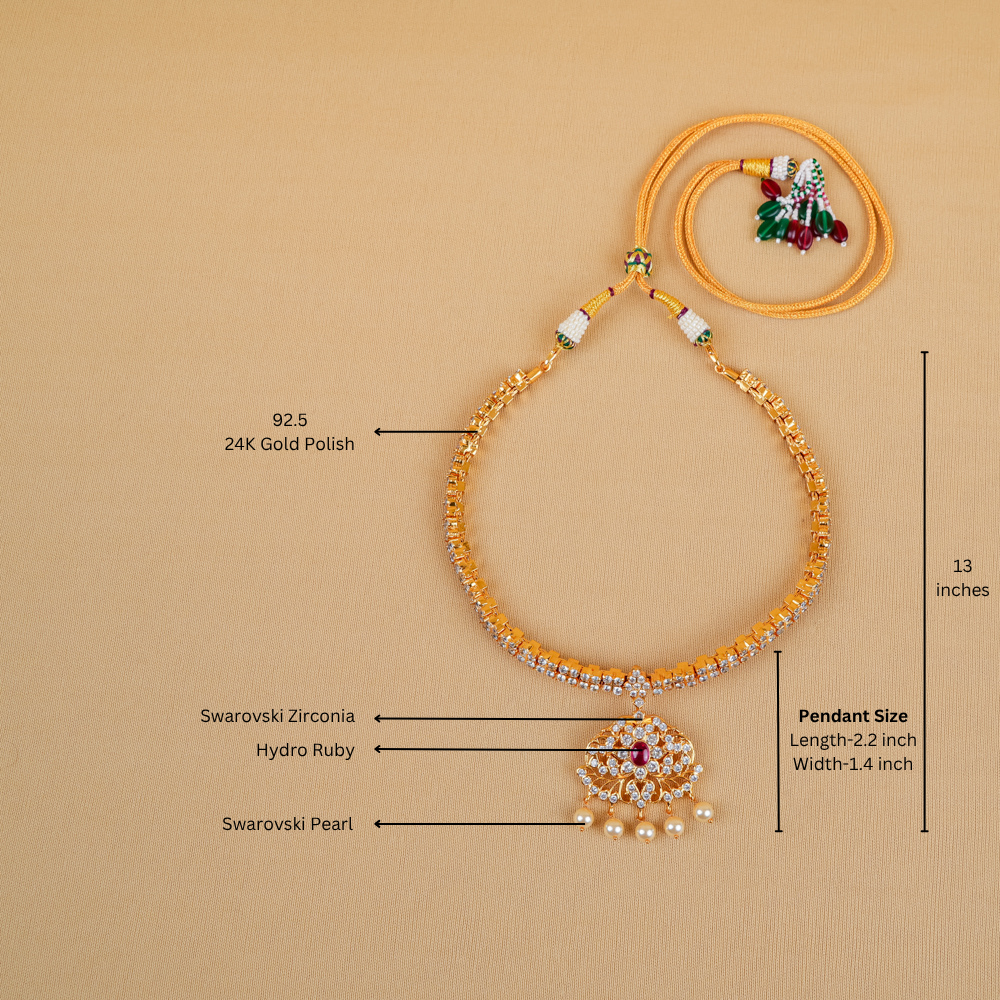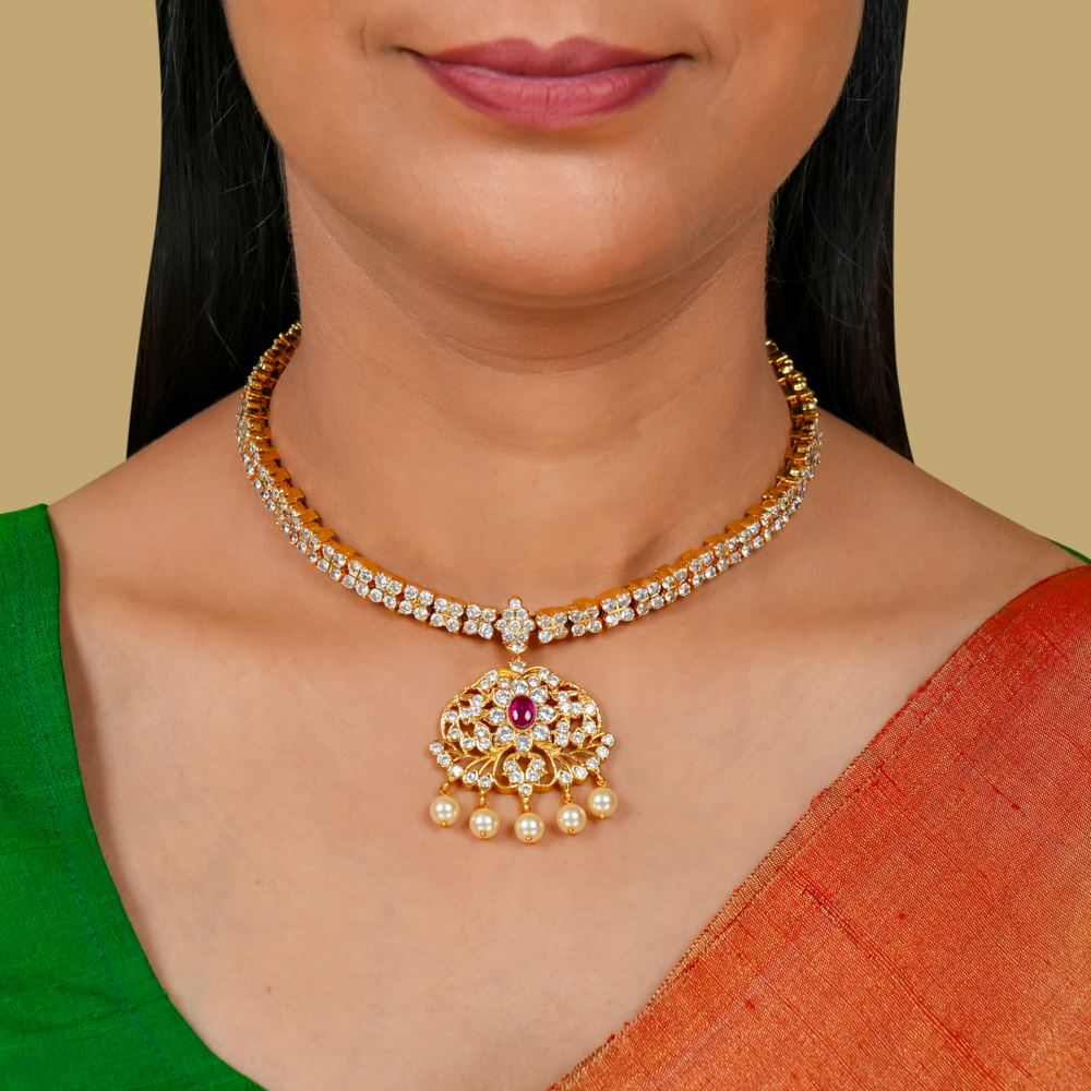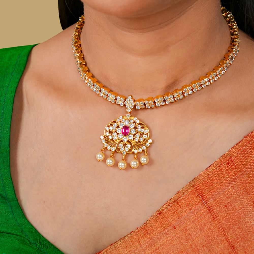 The traditional Red Addigai necklace carries a rich legacy rooted in Indian heritage. Once designed to embellish royalty, this timeless piece has evolved into an essential part of South Indian bridal wear. Hand crafted in 92.5 silver and adorned with high-quality Swarovski zirconia, it beautifully mirror the brilliance of real diamond jewelry. This elegant piece is an ideal choice to complement your traditional attire for special occasions.