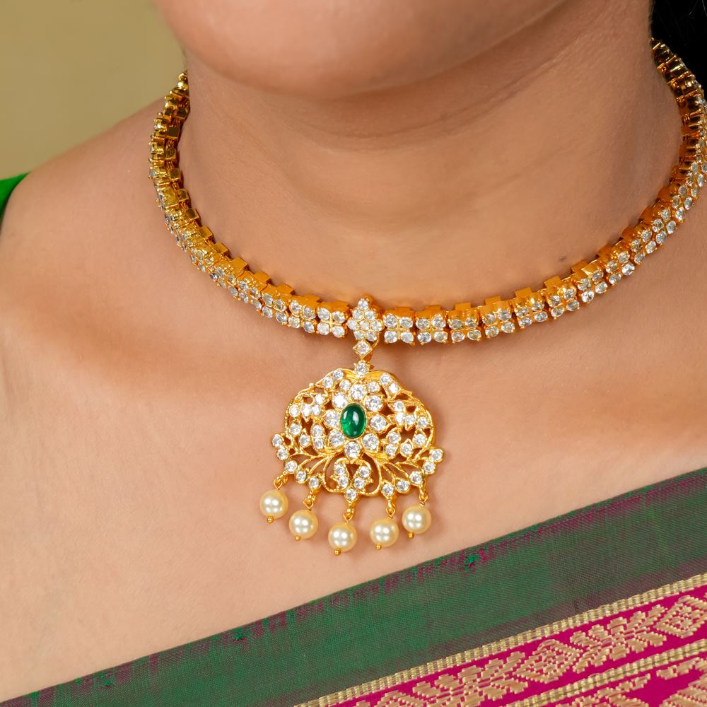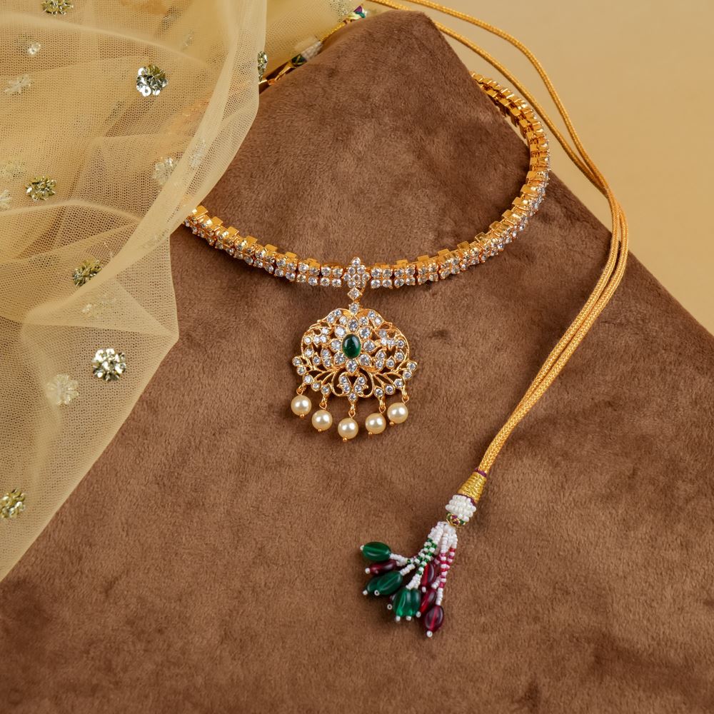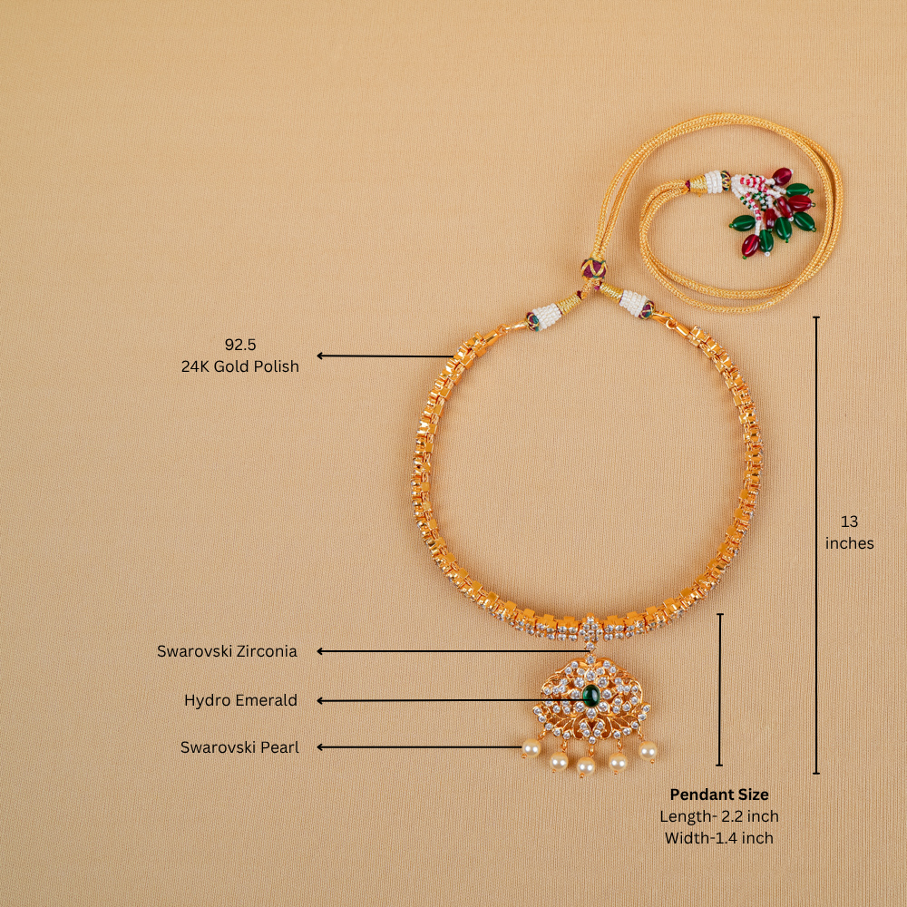 The traditional Green Addigai necklace carries a rich legacy rooted in Indian heritage. Once designed to embellish royalty, this timeless piece has evolved into an essential part of South Indian bridal wear. Hand crafted in 92.5 silver and adorned with high-quality Swarovski zirconia, it beautifully mirror the brilliance of real diamond jewelry. This elegant piece is an ideal choice to complement your traditional attire for special occasions.