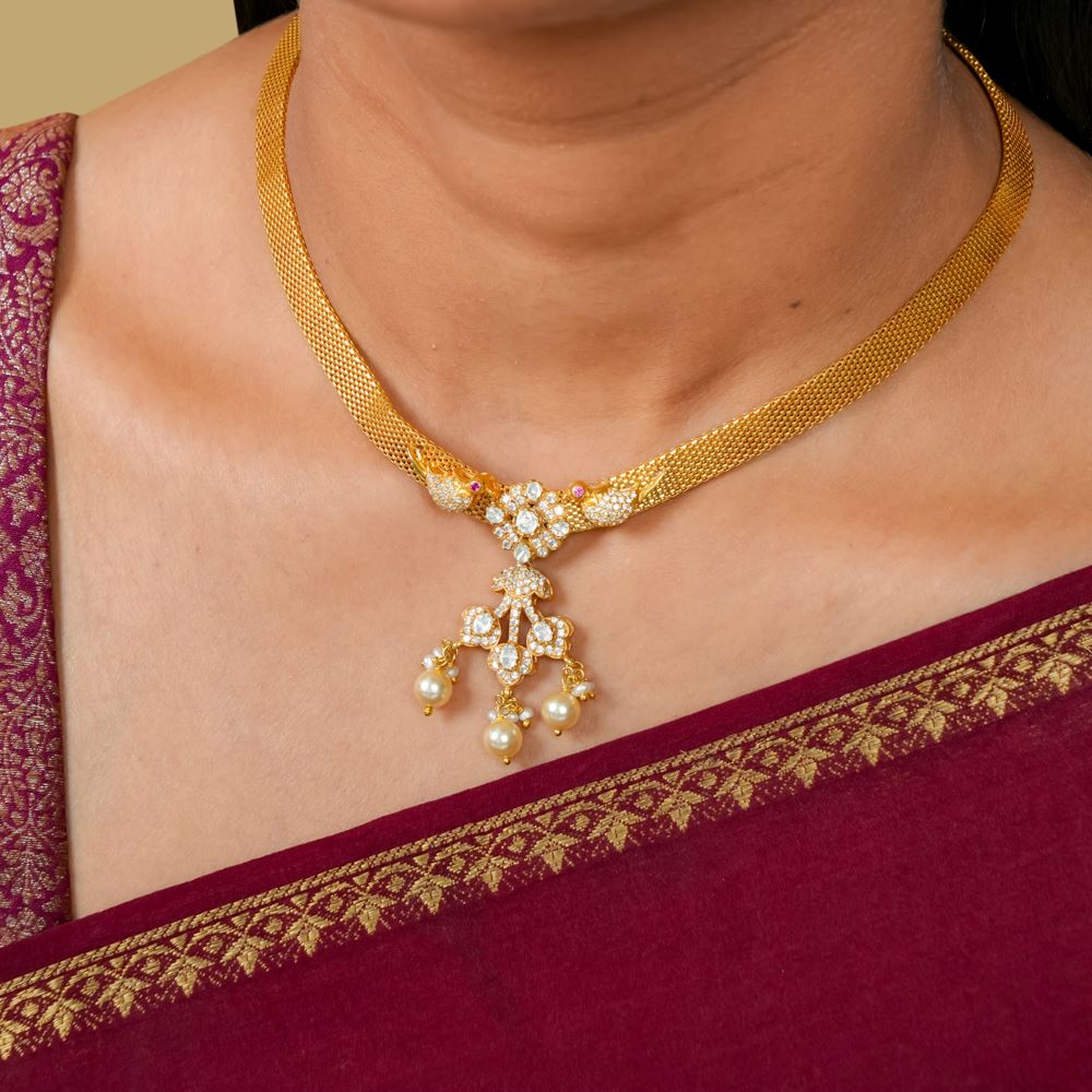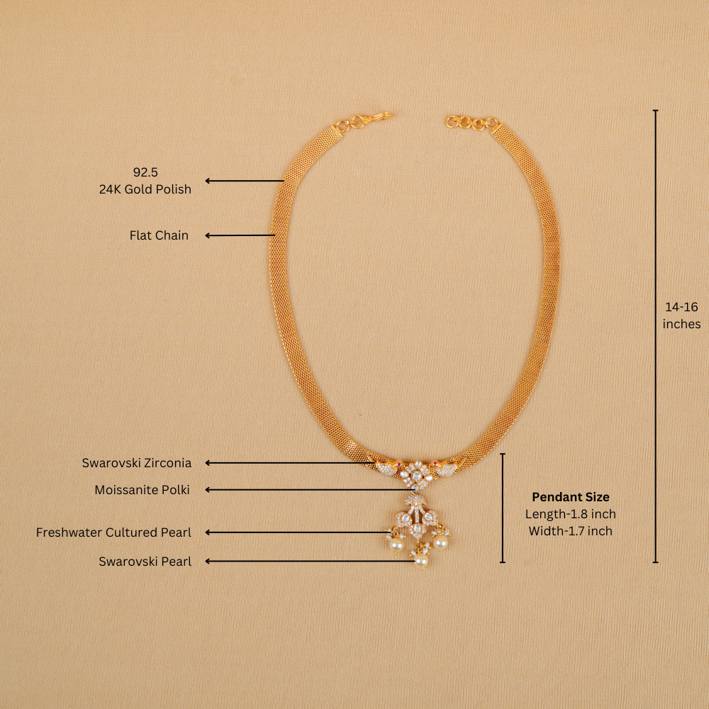 This enchanting necklace captures the beauty of nature with its captivating design, featuring twin birds with radiant moissanite polki and Swarovski Zirconia. Handcrafted in 92.5 silver, it’s a versatile accessory that effortlessly complements both casual and dressy looks, adding a unique and distinctive flair to your style.