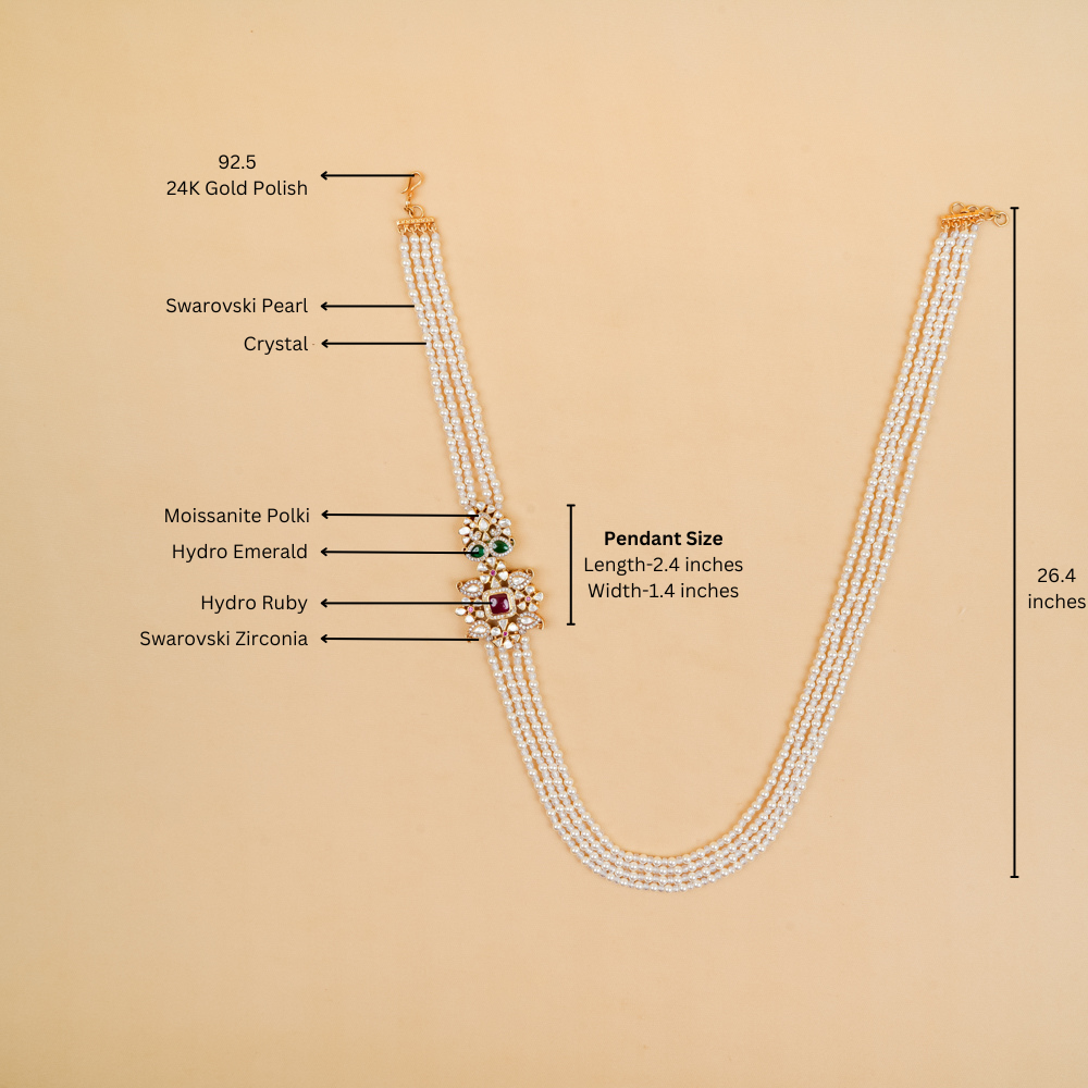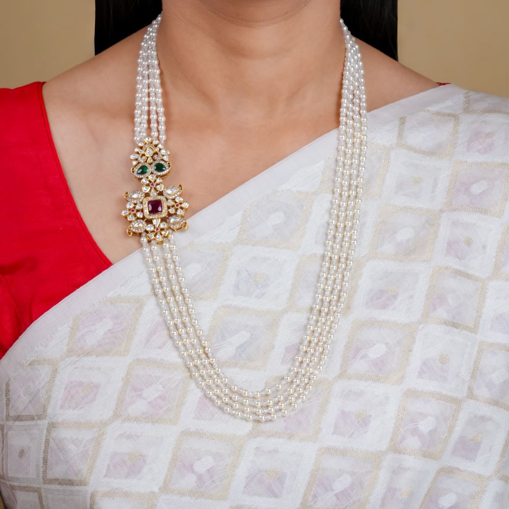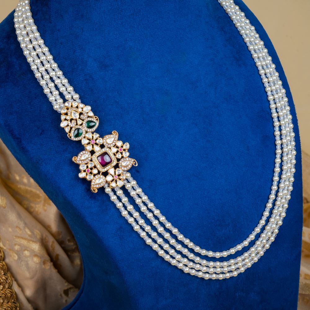 This exquisite handcrafted four-layer necklace, adorned with shimmering crystals and elegant Swarovski pearls, features a striking side mop pendant that makes a bold statement. It's the perfect accessory to complement any vibrant saree, adding a touch of elegance and glamour suitable for any formal occasion.