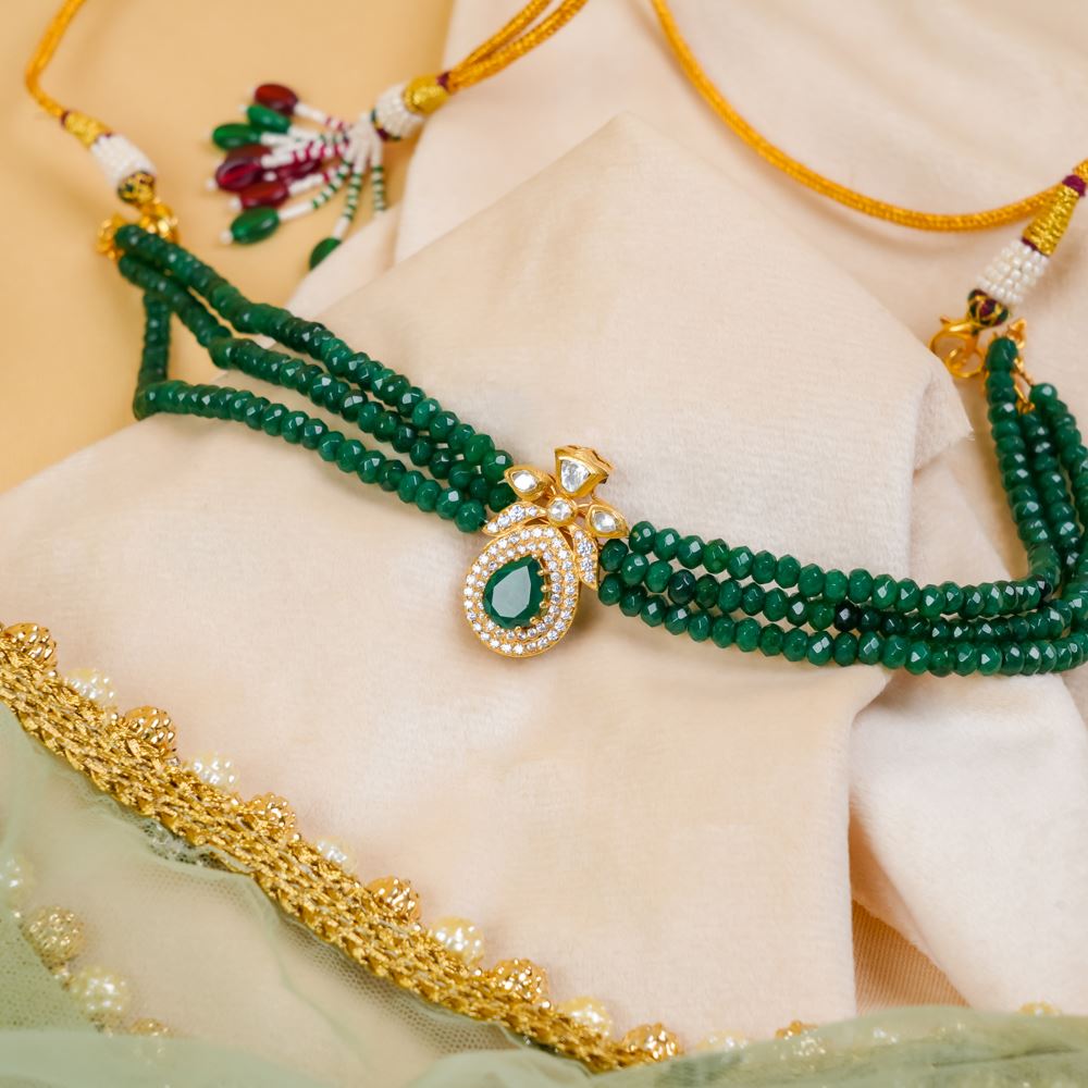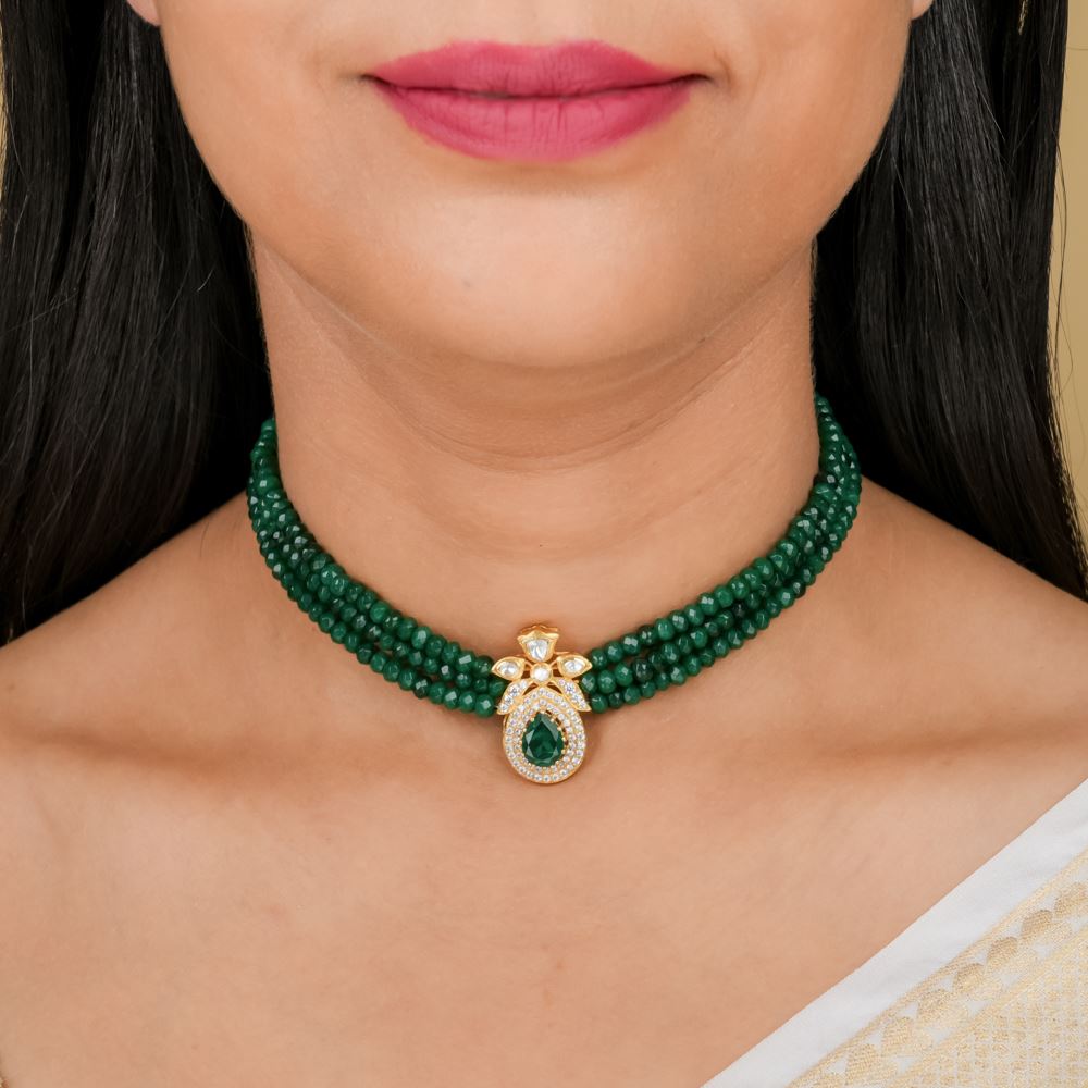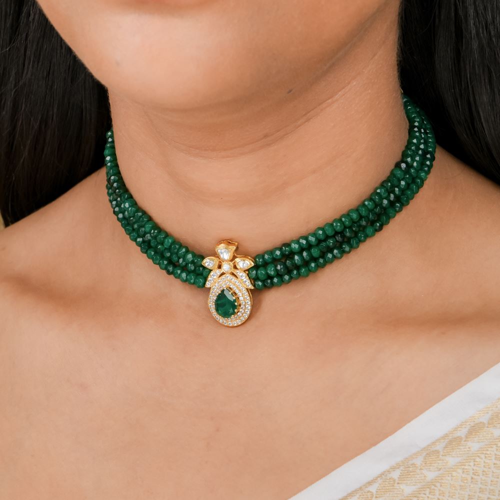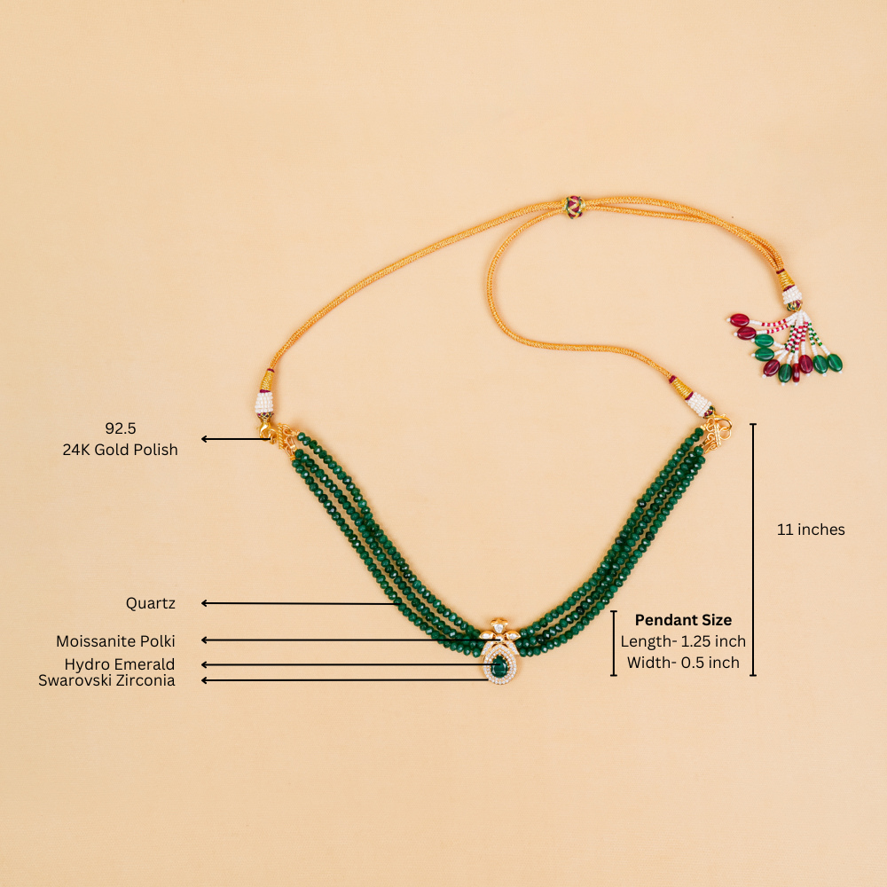 Looking for the ideal accessory to complement your saree or lehenga? This stunning necklace is the perfect choice! Featuring three layers of radiant green quartz that cascade beautifully, the centerpiece holds an enchanting pendant adorned with brilliant moissanite polki and Swarovski zirconia, creating a truly mesmerizing look.