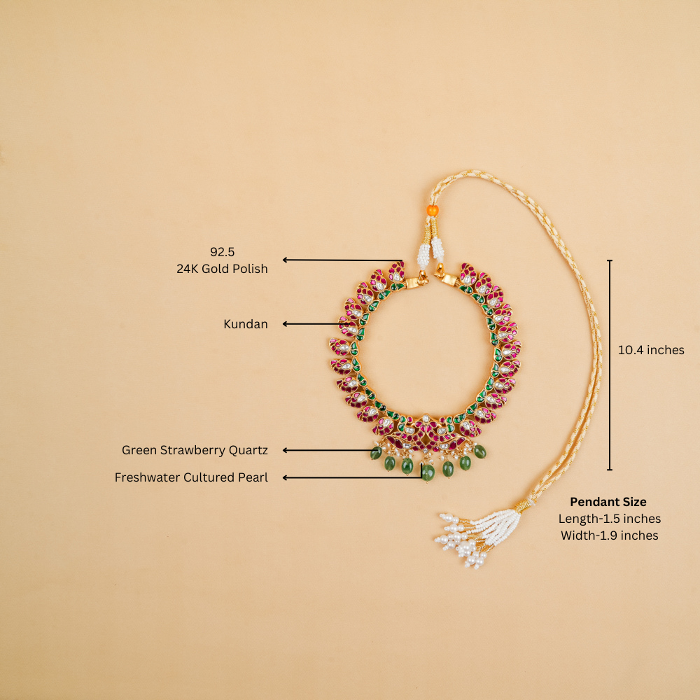 Unveil the elegance of these breathtaking mango pendants, adorned with intricate peacock motifs and masterfully set in 92.5 silver. Each detail reflects the meticulous craftsmanship that brings this piece to life, while the mesmerizing green strawberry quartz lends an extra layer of charm and vibrancy. This captivating statement necklace is the perfect choice for a bride-to-be, adding a touch of regal splendour to her special day or for anyone gracing a wedding celebration or grand occasion with timeless sophistication. Celebrate beauty and tradition with this exquisite creation, designed to turn heads and steal hearts.