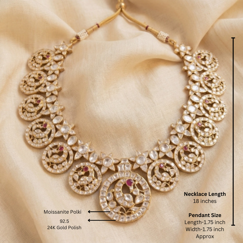 This royal traditional choker necklace is crafted in 92.5 pure silver and finished with premium 24K gold plating, giving it a rich heritage look. The necklace is designed with intricate Moissanite polki motives with peacock design, beautifully arranged in a traditional pattern. Each motif is highlighted with sparkling polki setting and accented with hydro ruby stones, adding a vibrant royal contrast.