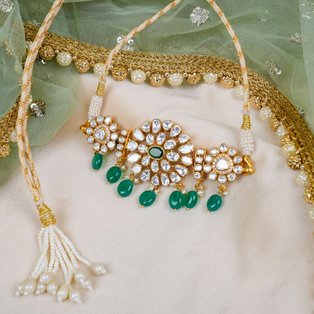 Ready to add some glamour, drama, and sparkle to your look? This showstopper is made for you! With its intricate design featuring moissanite polki, Green Onyx, and hydro emerald, it’s the ideal way to make a bold, unforgettable statement.