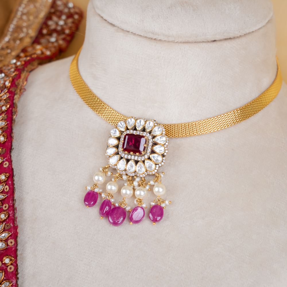 Discover the bold elegance of this choker, a piece that effortlessly commands attention. Handcrafted in silver 92.5, it features a striking blend of natural ruby, moissanite polki, Swarovski zirconia, and Swarovski pearls. This powerful statement piece is perfect for pairing with vibrant ensembles, adding a touch of sophistication to your look. Whether it’s a glamorous evening event or a high-fashion moment, this choker is designed to make you shine with confidence and allure.