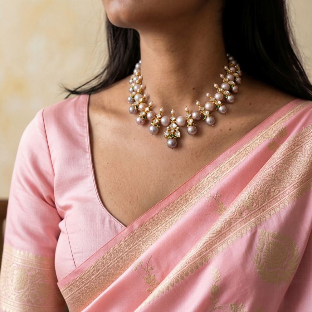 Indulge in timeless elegance with this stunning Moissanite Polki Necklace and earrings adorned with Natural Pink Shaded Pearls. Designed to capture the essence of heritage craftsmanship, this piece features radiant moissanite polki stones that beautifully complement the soft, romantic hues of natural pink shaded pearls. Set in silver 92.5, its delicate yet striking design enhances both traditional and contemporary outfits, adding a touch of sophistication and charm.