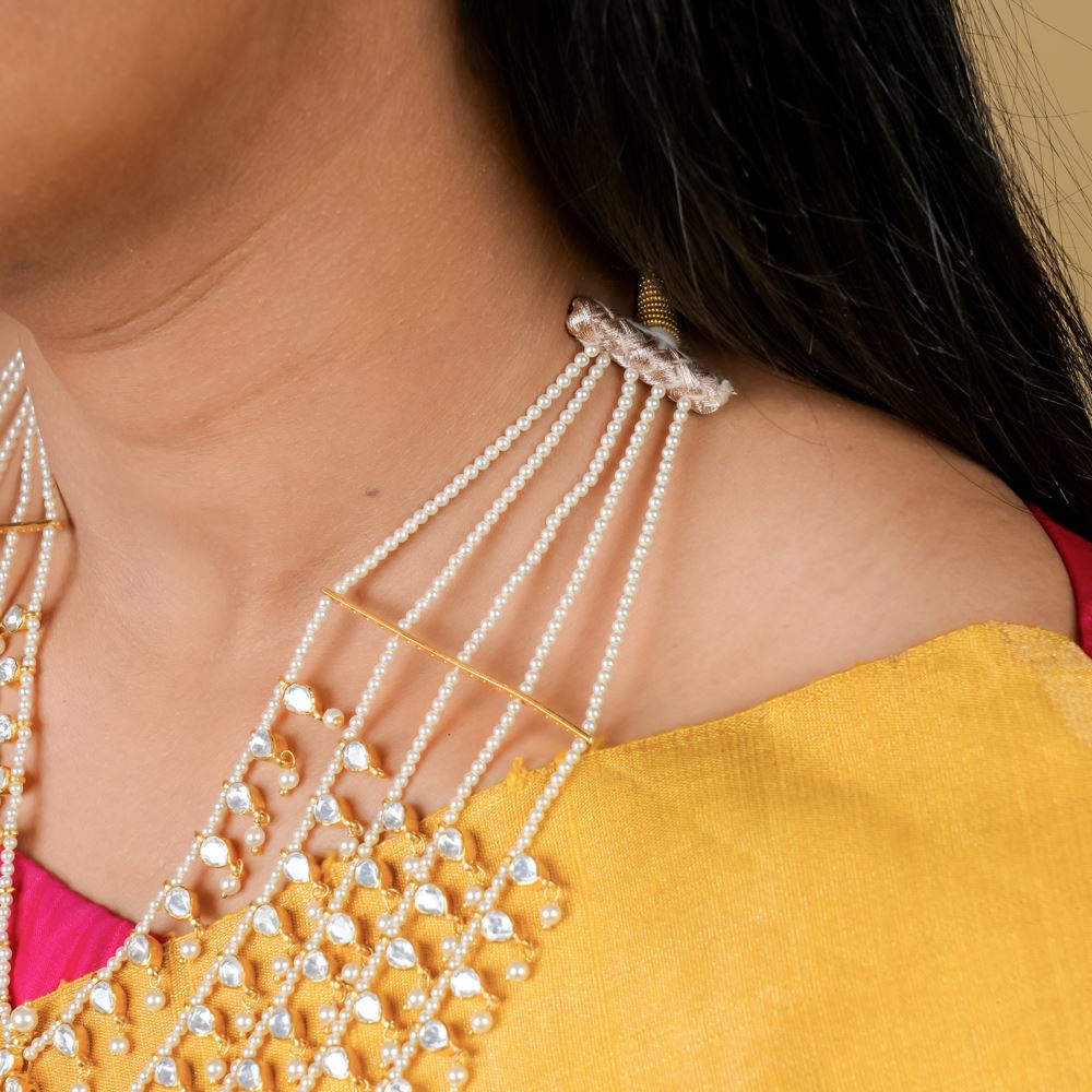 The Rani Haar necklace is a timeless masterpiece that transcends fleeting trends. Its five layers of shimmering moissanite polki strands, each graced with a pendant adorned with delicate green quartz, exude elegance and charm. Crafted in 92.5 silver, this necklace effortlessly complements any saree or vibrant lehenga. With its unique blend of captivating allure and understated grace, the Rani Haar is a versatile adornment, making it a cherished companion for any occasion.