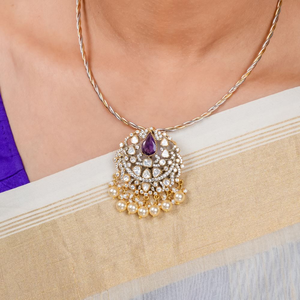 Introducing an exquisite masterpiece: this one-of-a-kind pendant, where the deep, regal allure of amethyst meets the dazzling sparkle of moissanite polki in perfect harmony. Handcrafted with meticulous care, the rich purple hues of the amethyst radiate a serene elegance, while the intricately set moissanite polki adds a luminous brilliance. This unique design strikes an impeccable balance, blending timeless sophistication with modern charm.