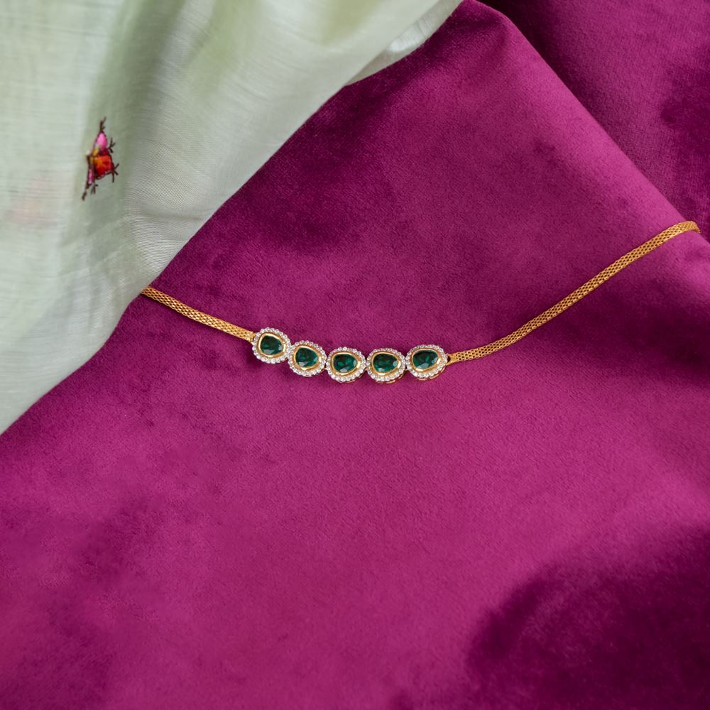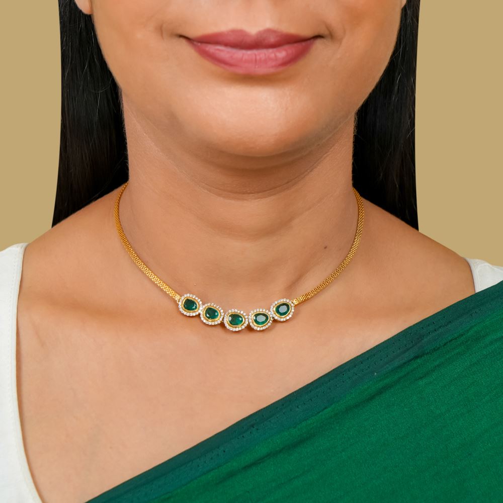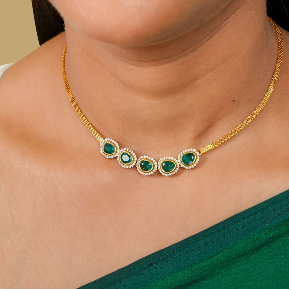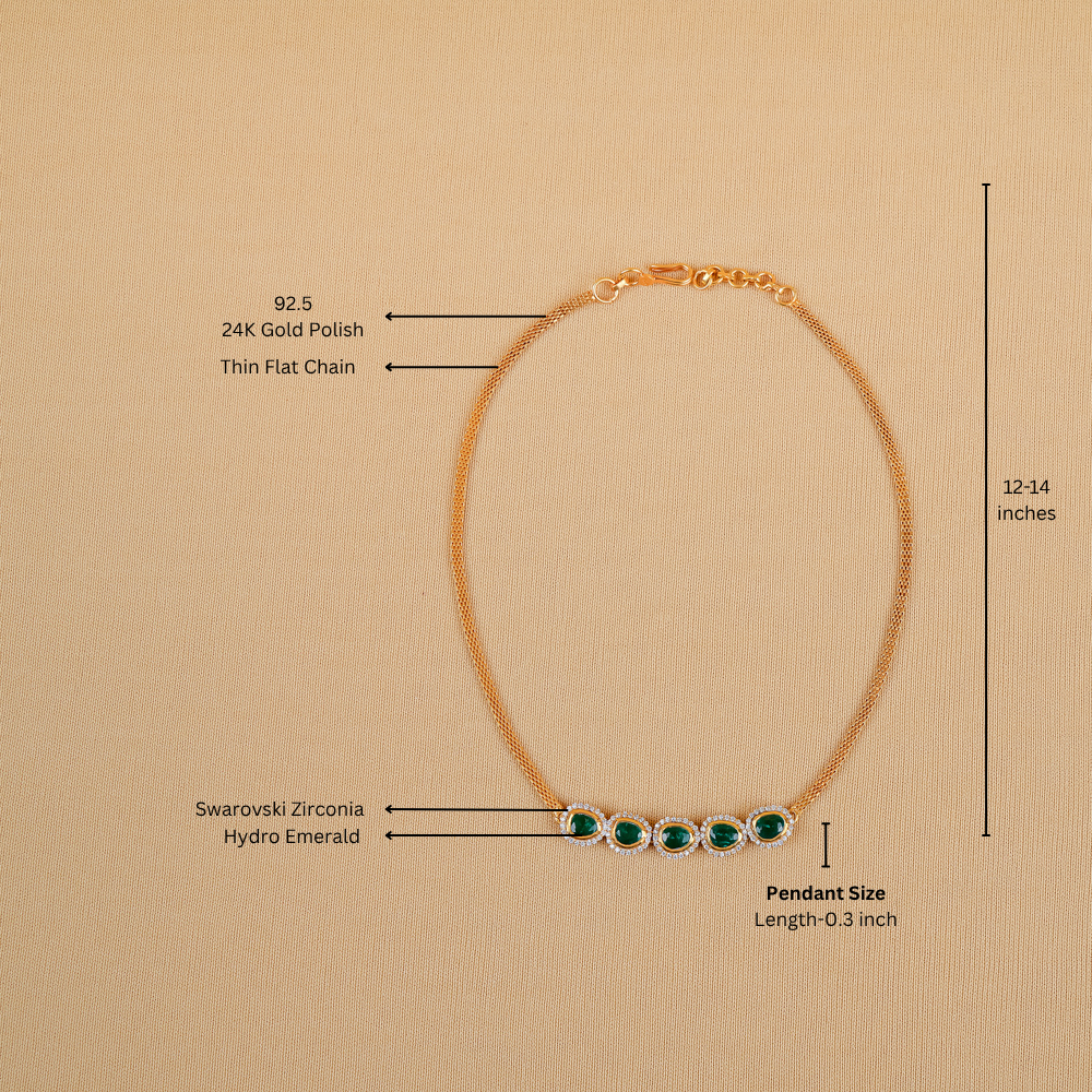 This elegant necklace features a radiant hydro emerald centerpiece accented with sparkling Swarovski zirconia, delicately set on a thin flat chain. Handcrafted in silver 92.5, it is perfect for adding a subtle touch of sophistication to your casual wear as well as special occasion looks.