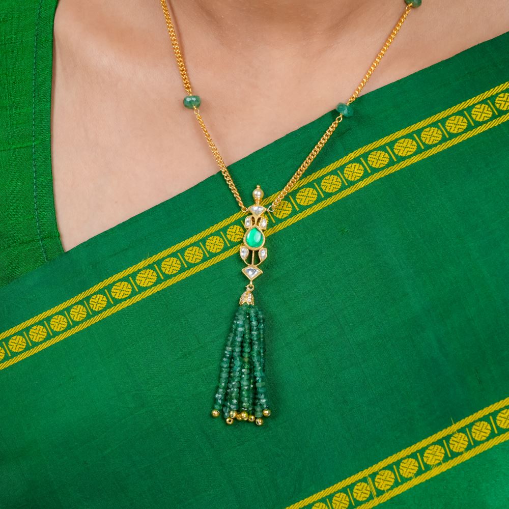 This exquisite natural emerald tassel necklace is a statement piece, perfect for elevating your everyday style. Its vibrant green hues add a touch of elegance, making it a versatile accessory for any occasion. Pair it with a white chikankari kurti for a striking contrast that enhances your charm and sophistication. This necklace ensures you shine effortlessly for casual outings or special moments.