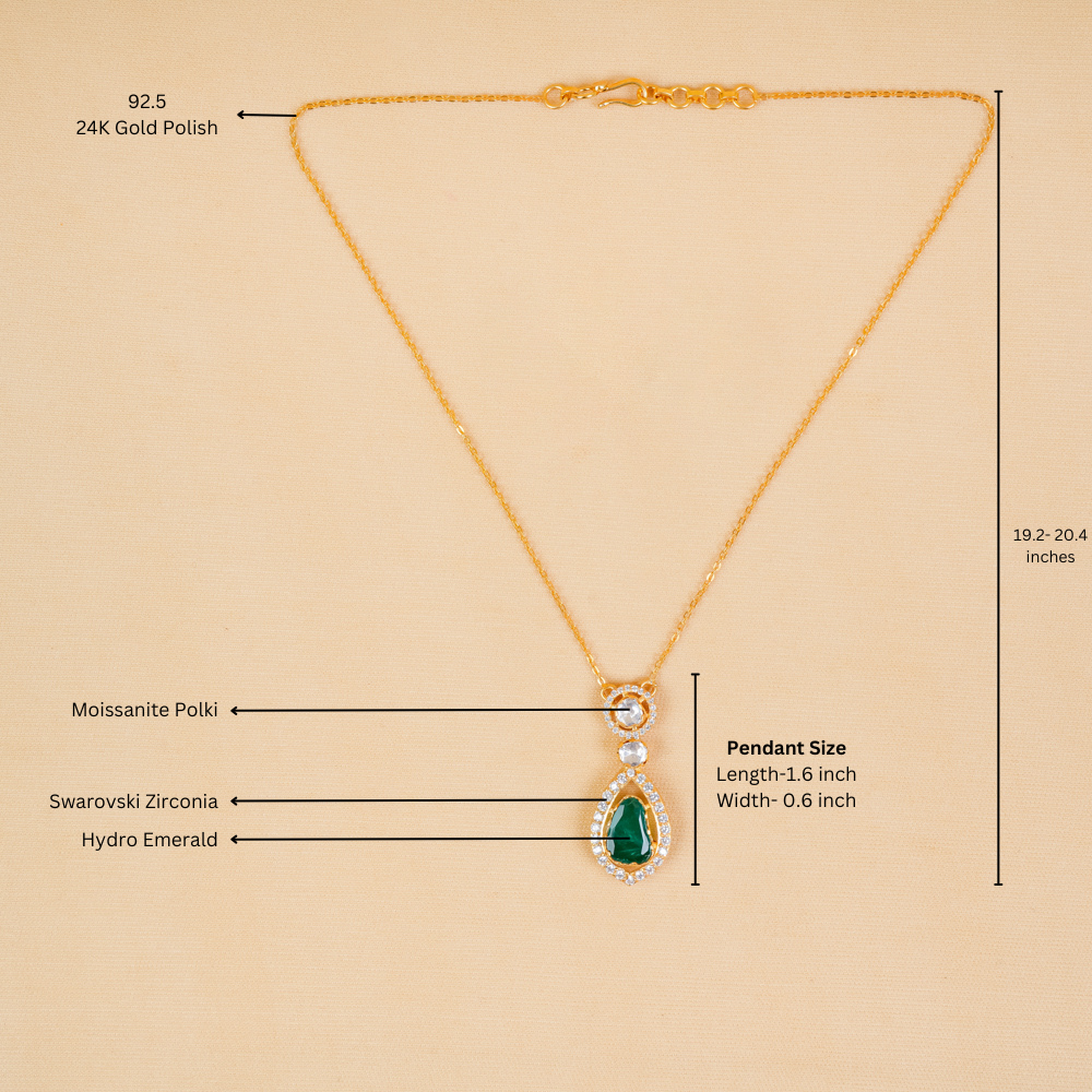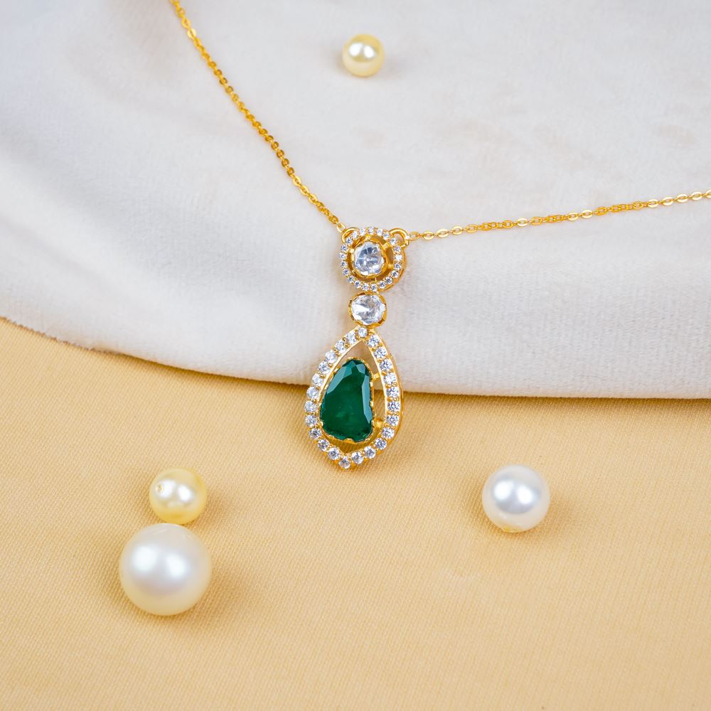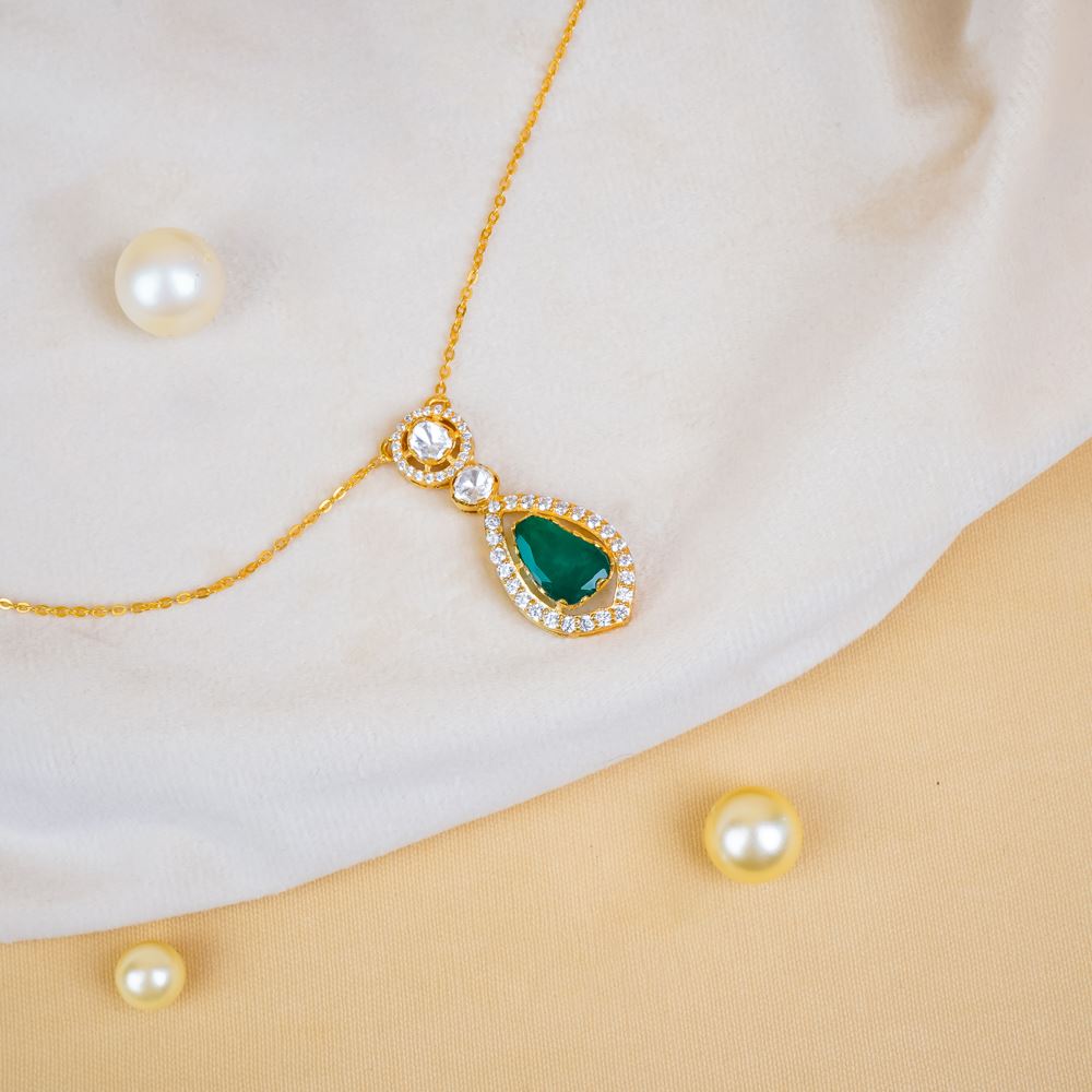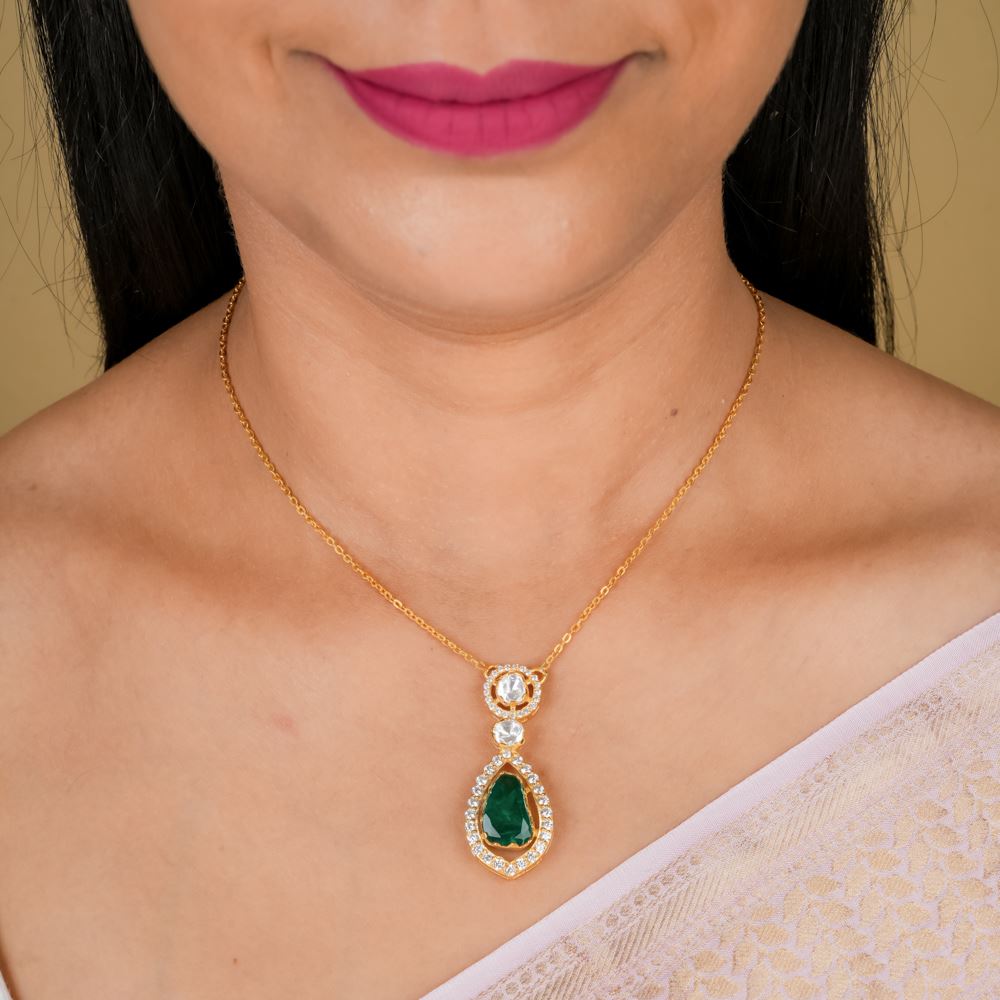 Simple yet striking, this necklace effortlessly grabs attention with style. Graceful and playful, it proves elegance can have a twinkle. Featuring hydro emerald, moissanite polki, and Swarovski zirconia, it redefines "simple and elegant."