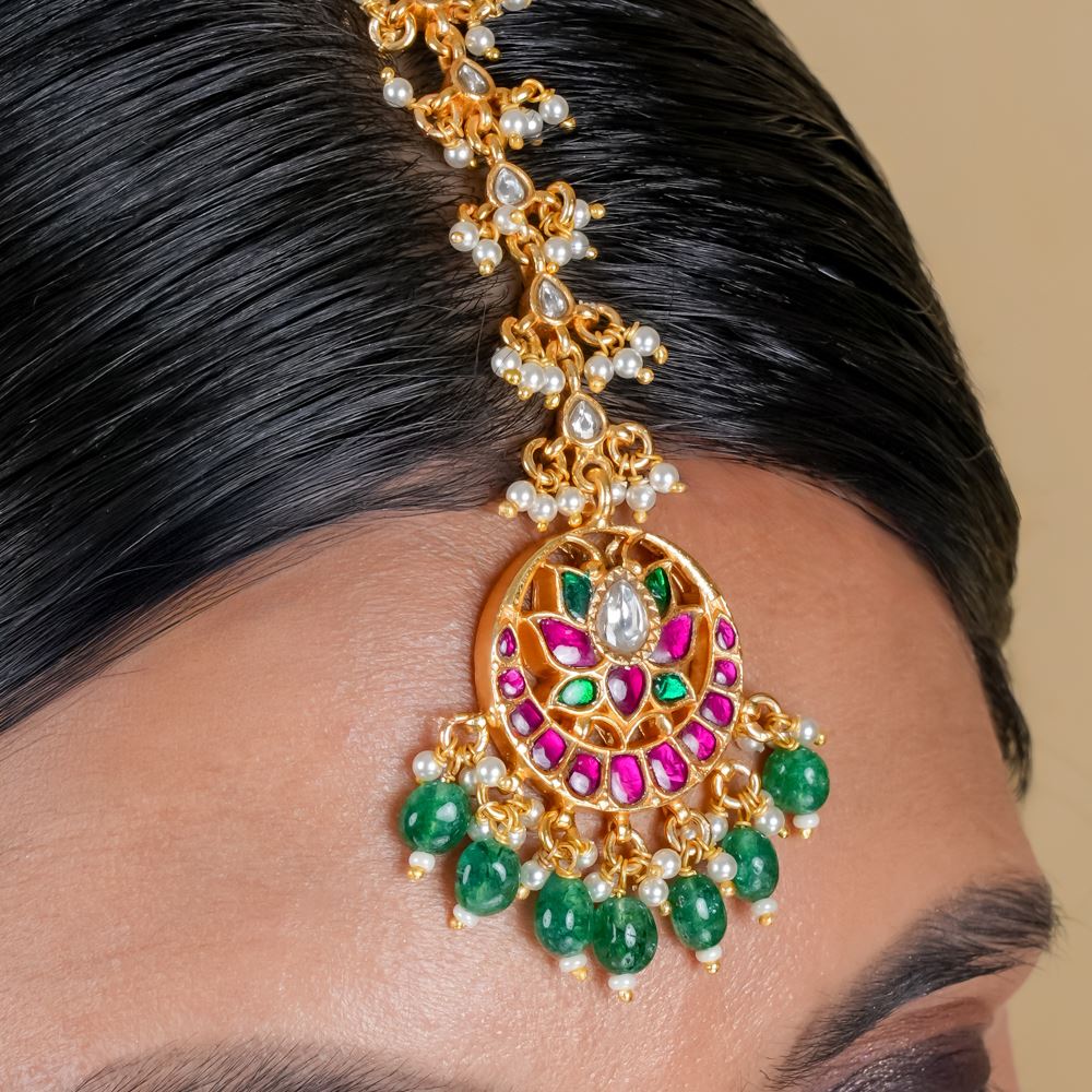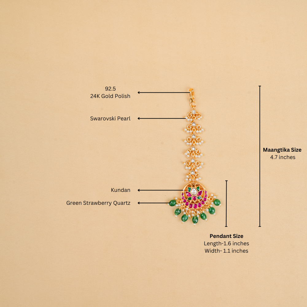 Elevate your ensemble with this breathtaking Kundan Maangtika, a piece that beautifully captures traditional charm. Adorned with lustrous green strawberry quartz and Swarovski pearl dressing, this exquisite accessory adds an enchanting touch to any wedding or festive occasion.