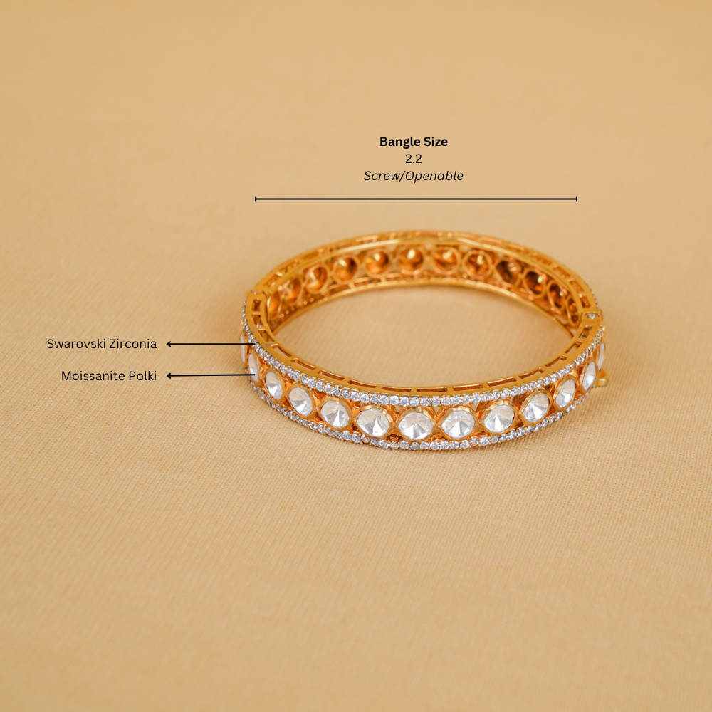 Premium 92.5 silver 24K gold plated openable kada bangle studded with Moissanite Polki and Swarovski Zirconia, designed in a royal traditional style. This elegant screw-open bangle is perfect for wedding wear, festive jewellery, and ethnic outfits, giving a rich gold look with the durability of silver.