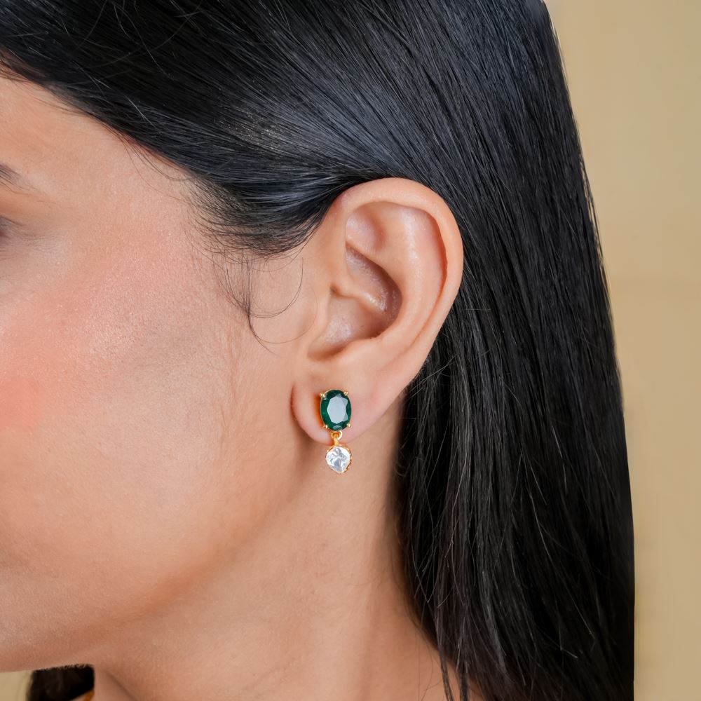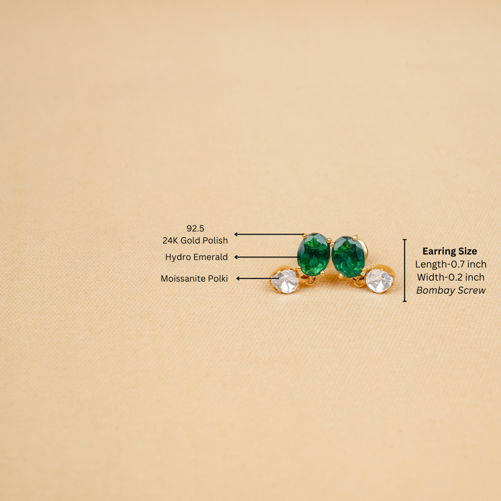 Elevate your look with these dainty earrings which seamlessly blend elegance and charm and are perfect for both Western and traditional ensembles. Crafted from 92.5 silver, they feature a stunning combination of moissanite polki and hydro emerald, adding a touch of luxury and sophistication to any outfit.