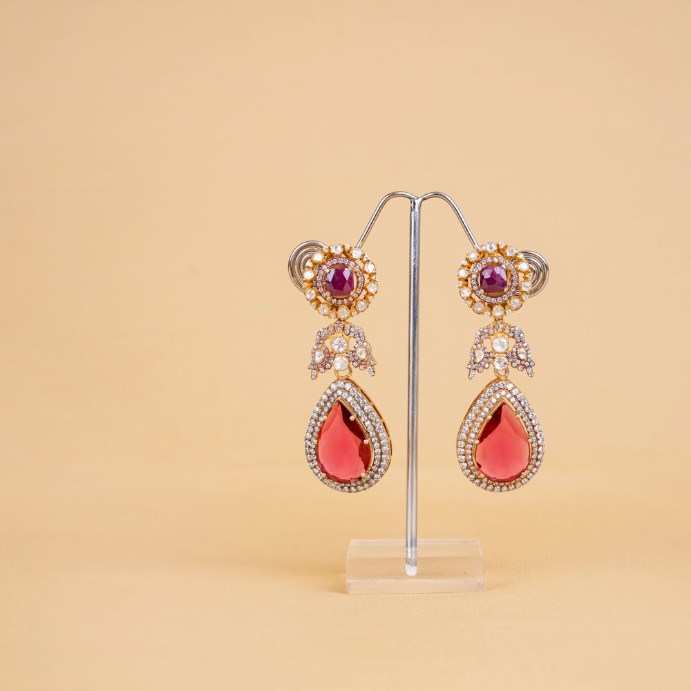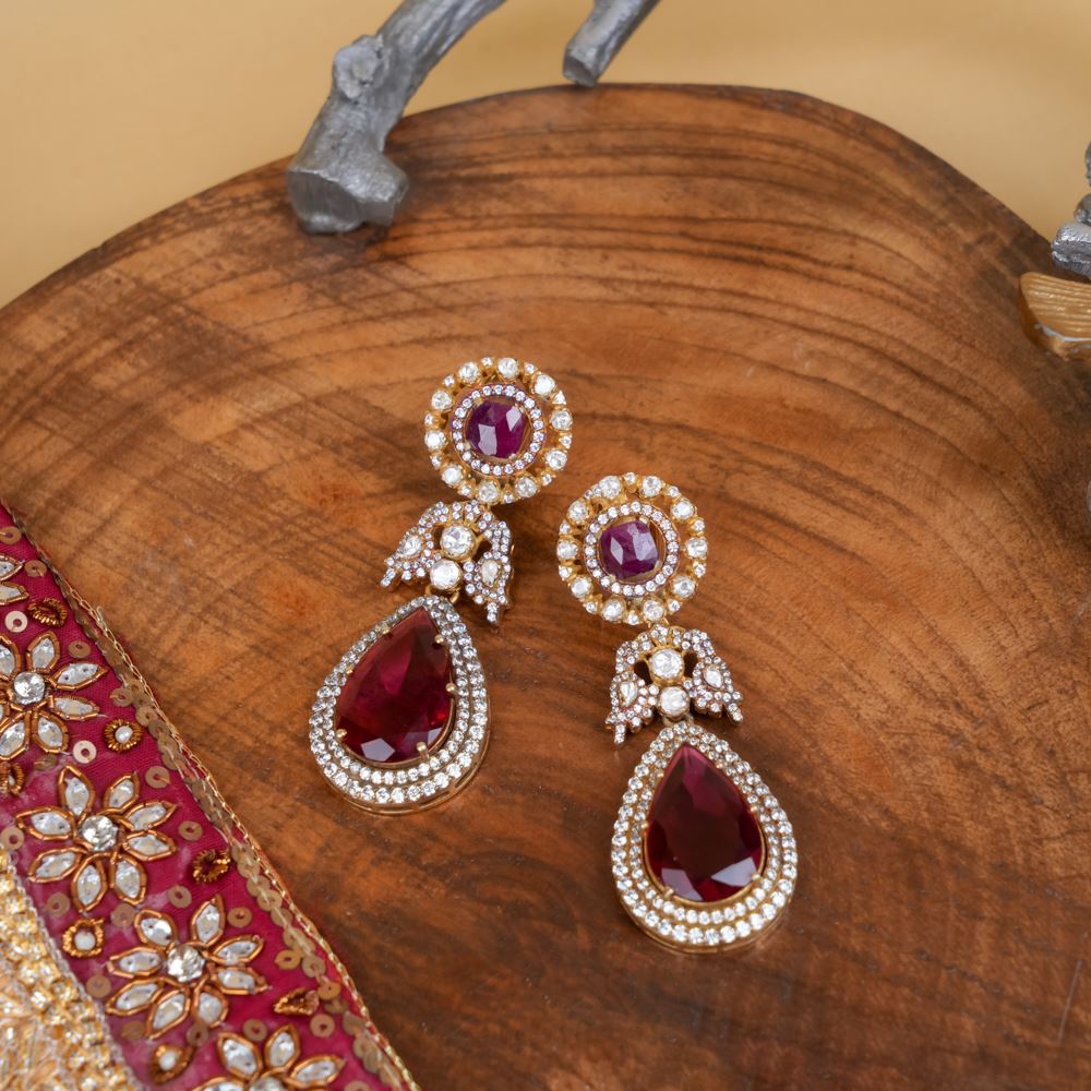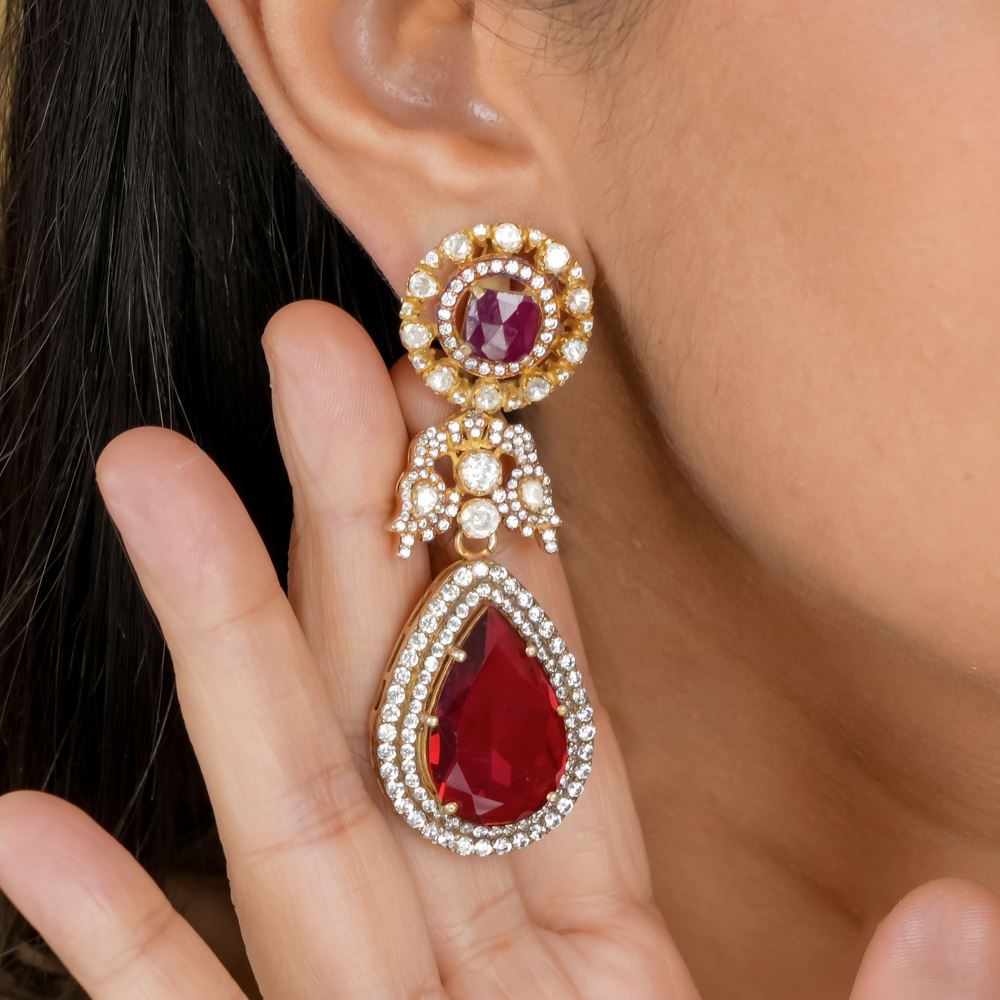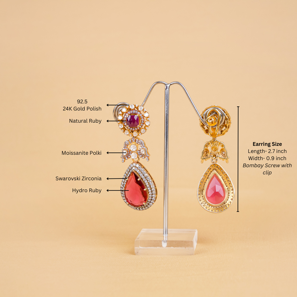 Envision an exquisite earring embellished with shimmering moissanite polki, dazzling Swarovski zirconia, natural ruby, and hydro ruby, meticulously crafted to enhance the allure of a stunning cocktail dress. Get ready to bask in the glow of compliments all night long.