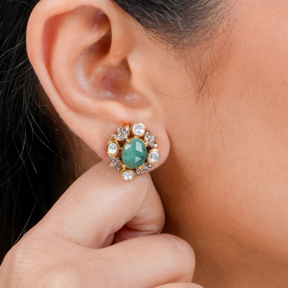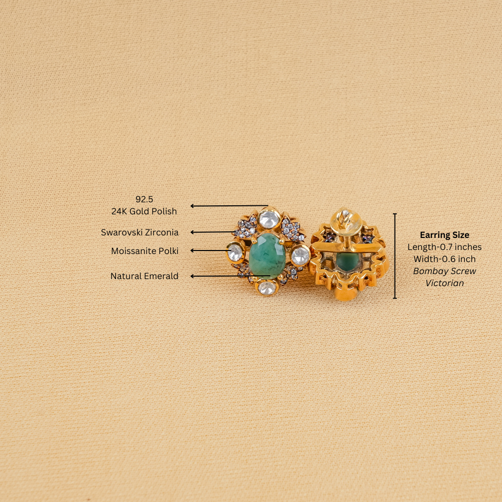 This stud exudes elegance with a natural emerald at its heart, delicately surrounded by shimmering moissanite polki and dazzling Swarovski zirconia. Its refined design adds a touch of timeless charm, making it the perfect accessory for a casual Sunday outing. Whether you're strolling through the farmer's market, sipping coffee with friends, or simply enjoying the day, these studs effortlessly elevate your look, offering that classy touch to your ensemble.