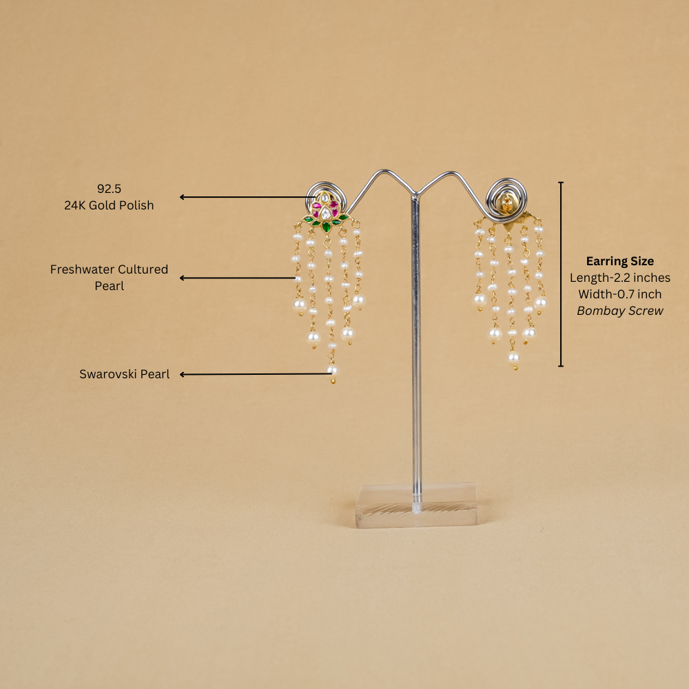Indulge in the exquisite allure of these stunning Kundan danglers, designed for true jewellery aficionados. Their unparalleled beauty catches the eye, featuring five elegant strands of shimmering freshwater cultured pearls that evoke a timeless elegance. Adorned with Swarovski pearl drops, these earrings perfectly blend classic charm and contemporary style, making them an exceptional addition to any jewellery collection.