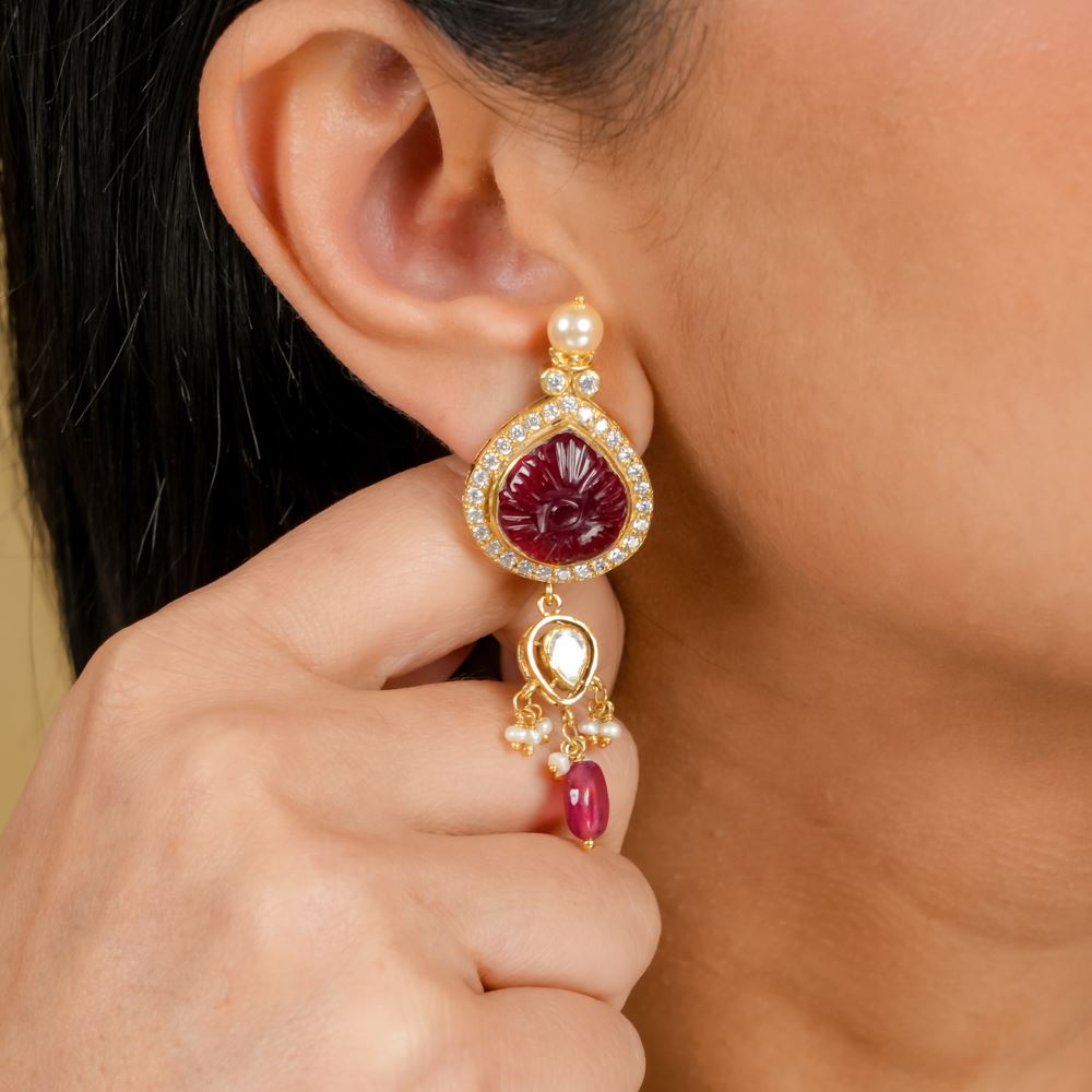 Stones: Natural Ruby, Hydro Ruby Carving, Moissanite Polki, Freshwater Cultured Pearl, Swarovski Zirconia,