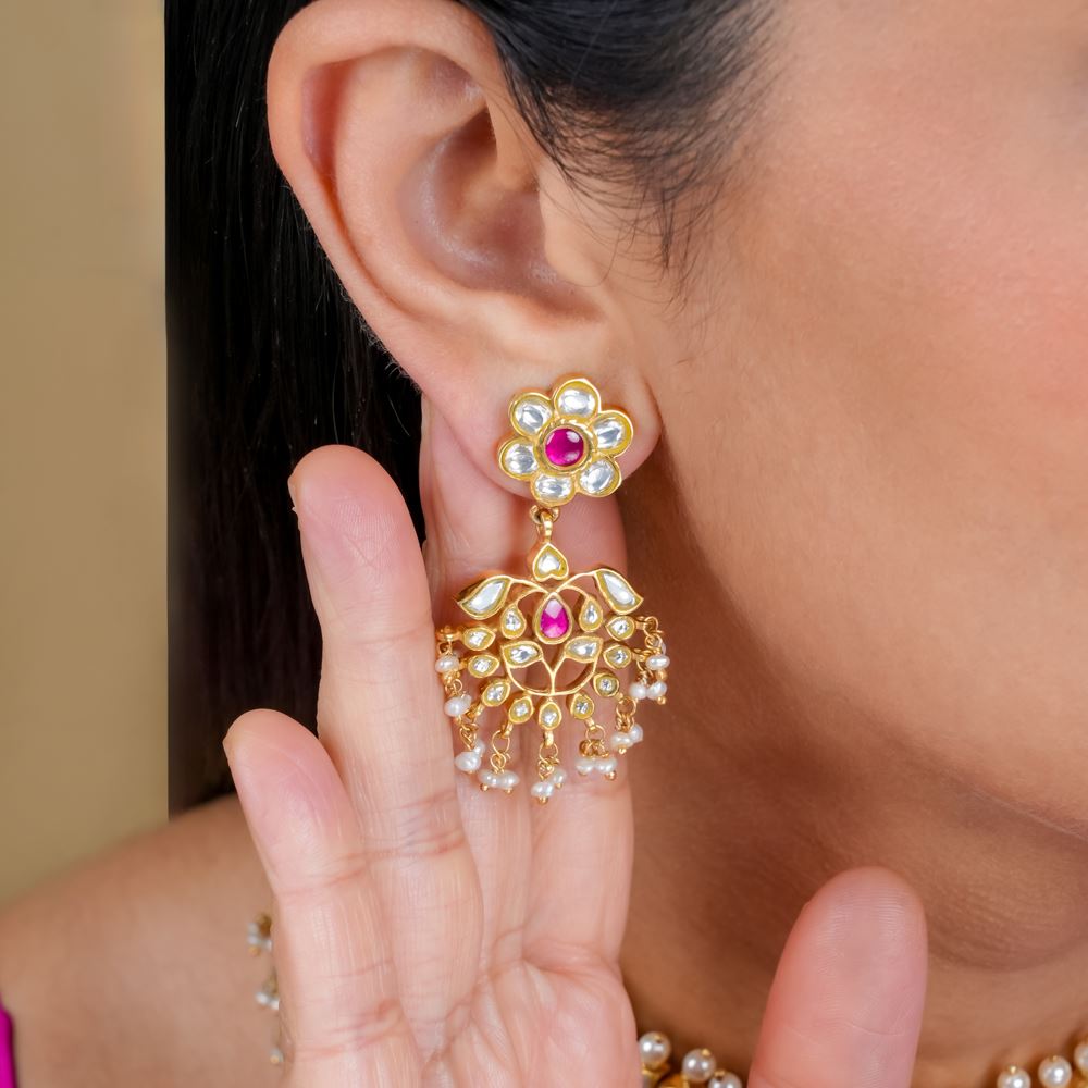 Floral Kundan Stud With Hanging Earrings