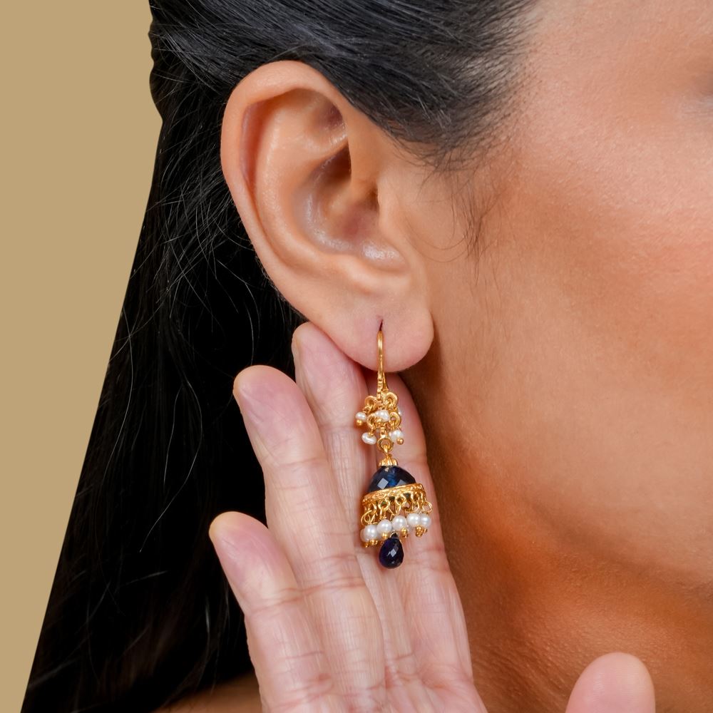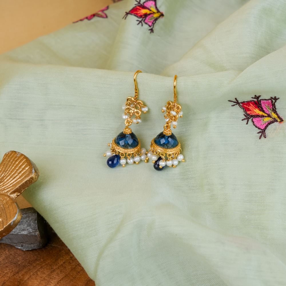This jhumki reinterprets traditional designs by blending diverse influences, enhancing your ensemble. Crafted from 92.5 silver, it showcases the elegance of a freshwater cultured pearl beautifully paired with hydro blue.