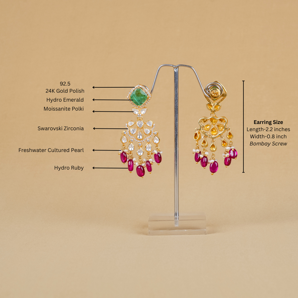 These eye-catching earrings showcase the enchanting beauty of moissanite polki, dazzling Swarovski zirconia, and the vibrant hues of hydro ruby and hydro emerald. Crafted with meticulous attention to detail, their intricate design is elegantly set in 92.5 silver, creating a stunning piece that effortlessly captivates the eye.