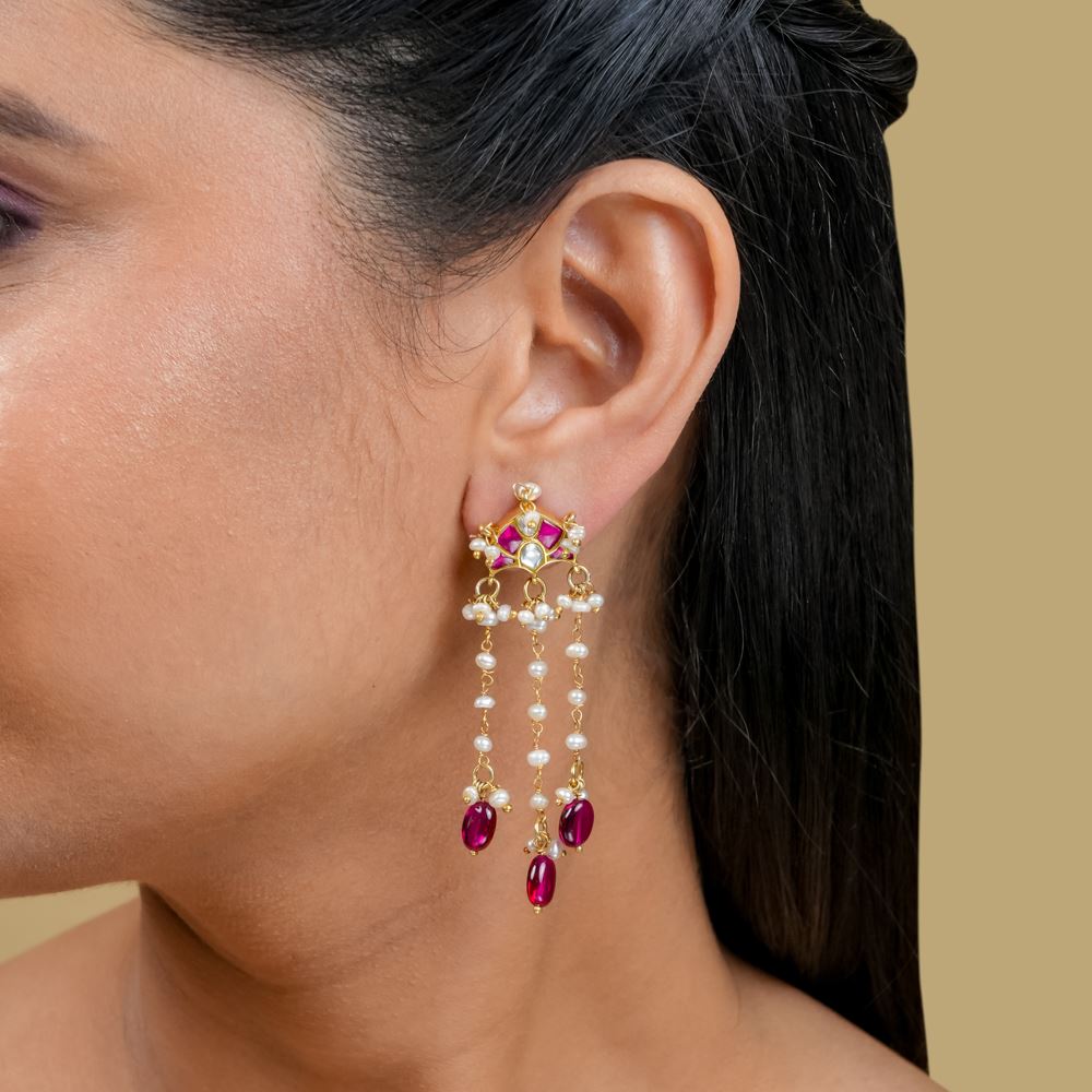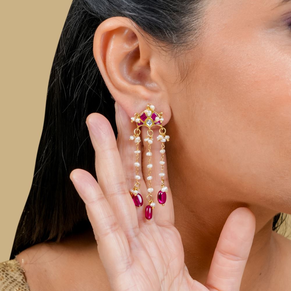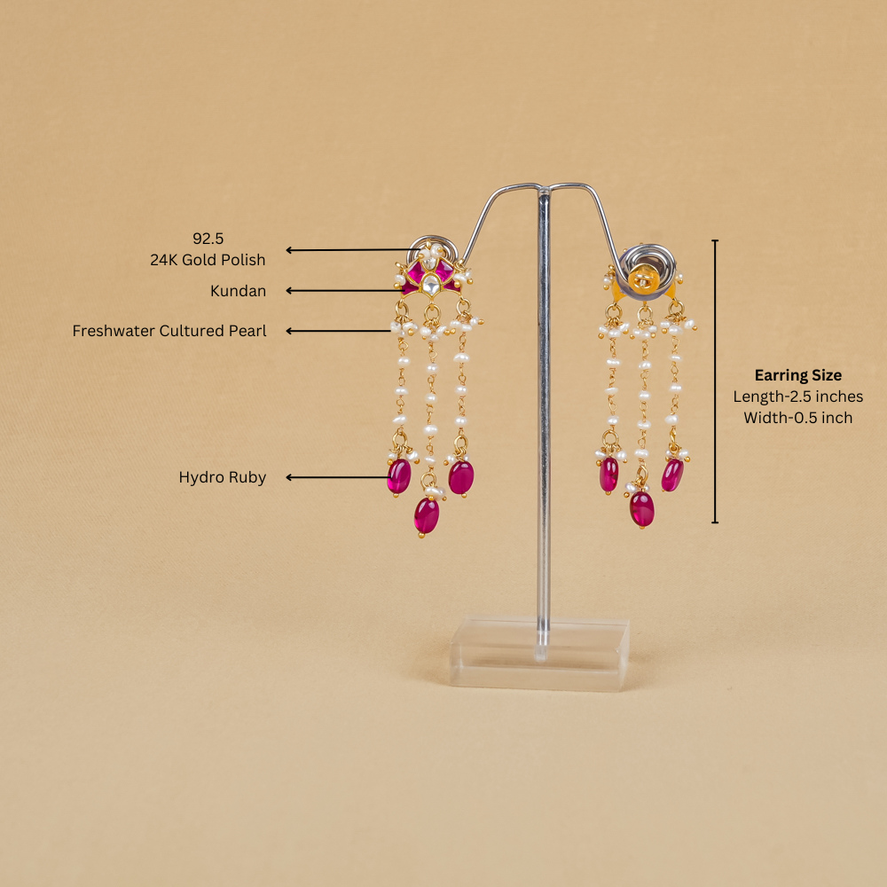 Indulge in the exquisite allure of these stunning Kundan danglers, designed for true jewellery aficionados. Their unparalleled beauty catches the eye, featuring three elegant strands of shimmering freshwater cultured pearls that evoke a timeless elegance. Adorned with hydro ruby drops, these earrings perfectly blend classic charm and contemporary style, making them an exceptional addition to any jewellery collection.