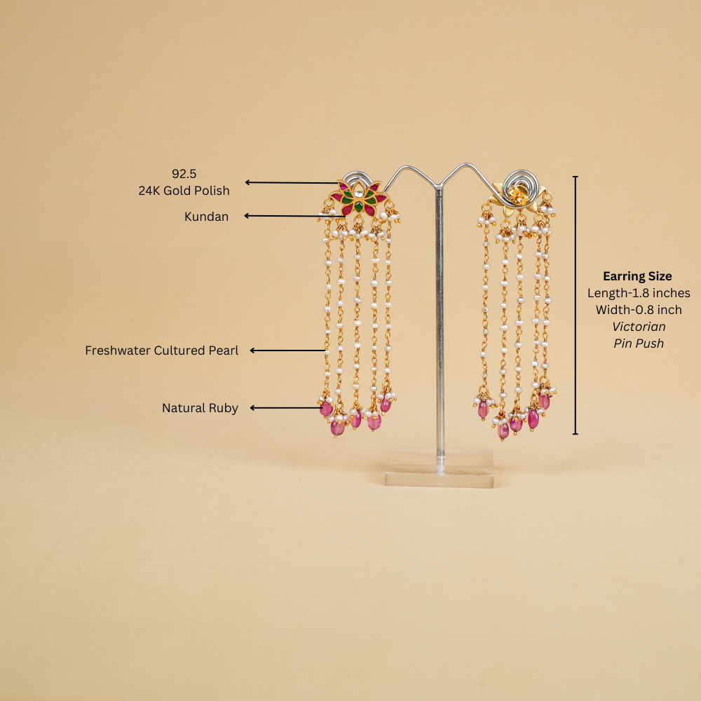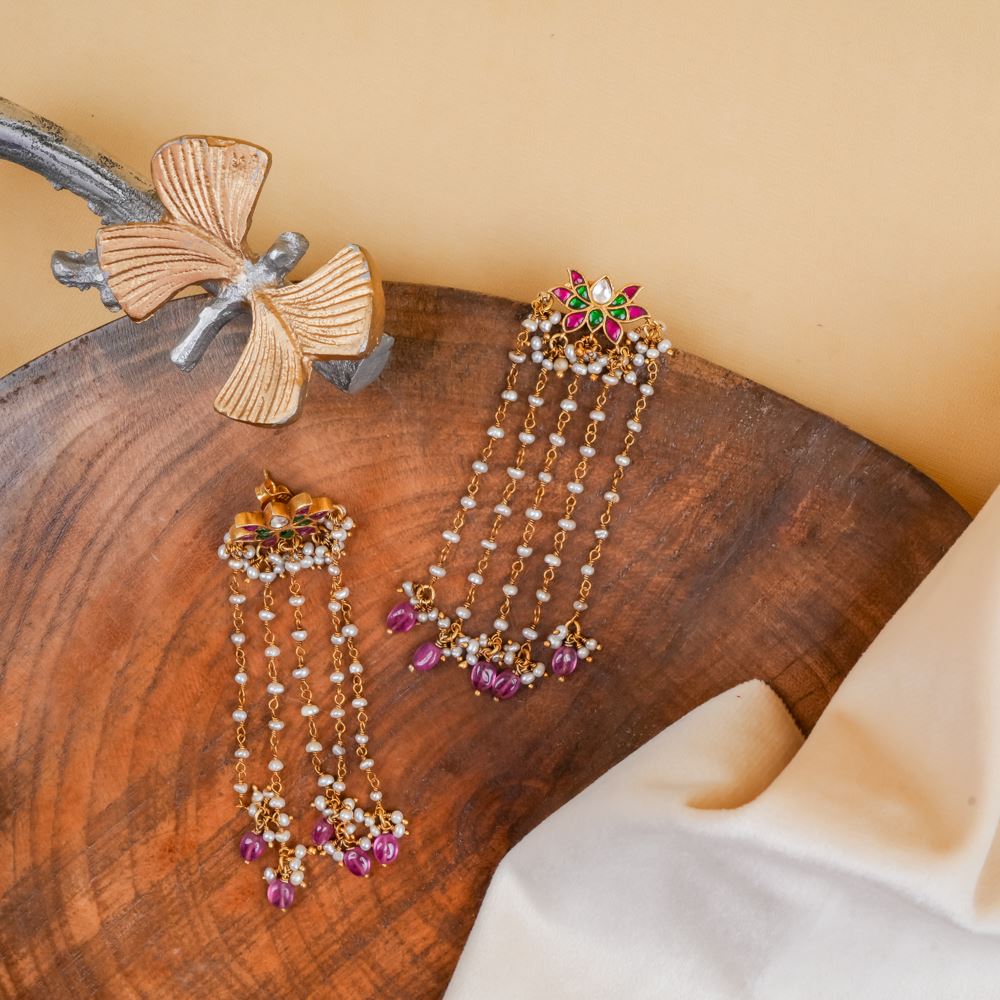 Indulge in the exquisite allure of these stunning Kundan danglers, designed for true jewellery aficionados. Their unparalleled beauty catches the eye, featuring five elegant strands of shimmering freshwater cultured pearls that evoke a timeless elegance. Adorned with natural ruby drops, these earrings are a perfect blend of classic charm and contemporary style, making them an exceptional addition to any jewelry collection.