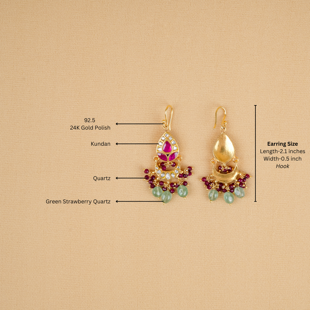 Prepare to be enchanted by these exquisite Kundan hook earrings! The mesmerizing red quartz beautifully complements the lush green strawberry quartz, creating a stunning visual harmony that is impossible to resist.