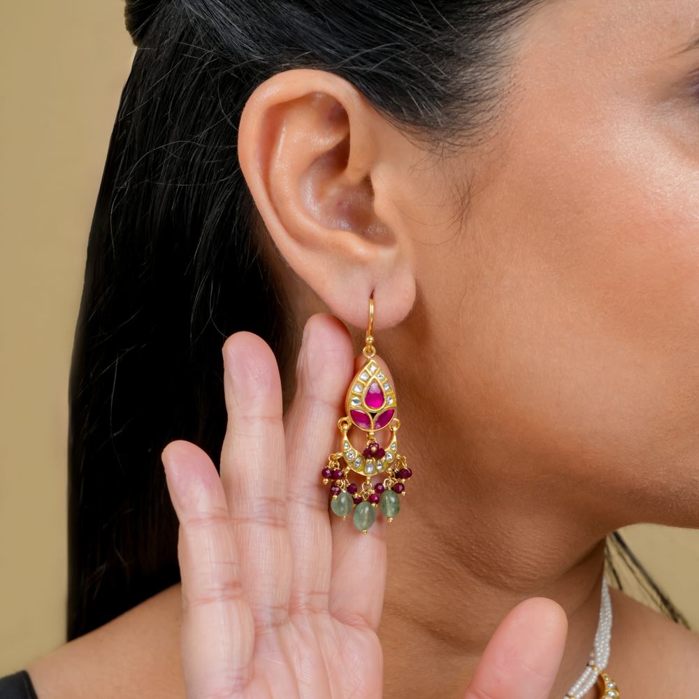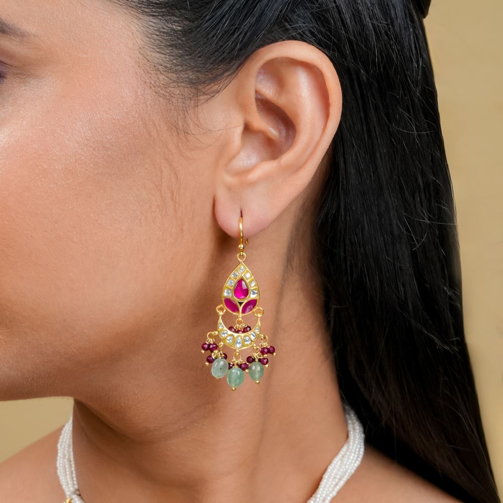 Kundan Hook Earrings With Red Quartz And Green Strawberry Quartz