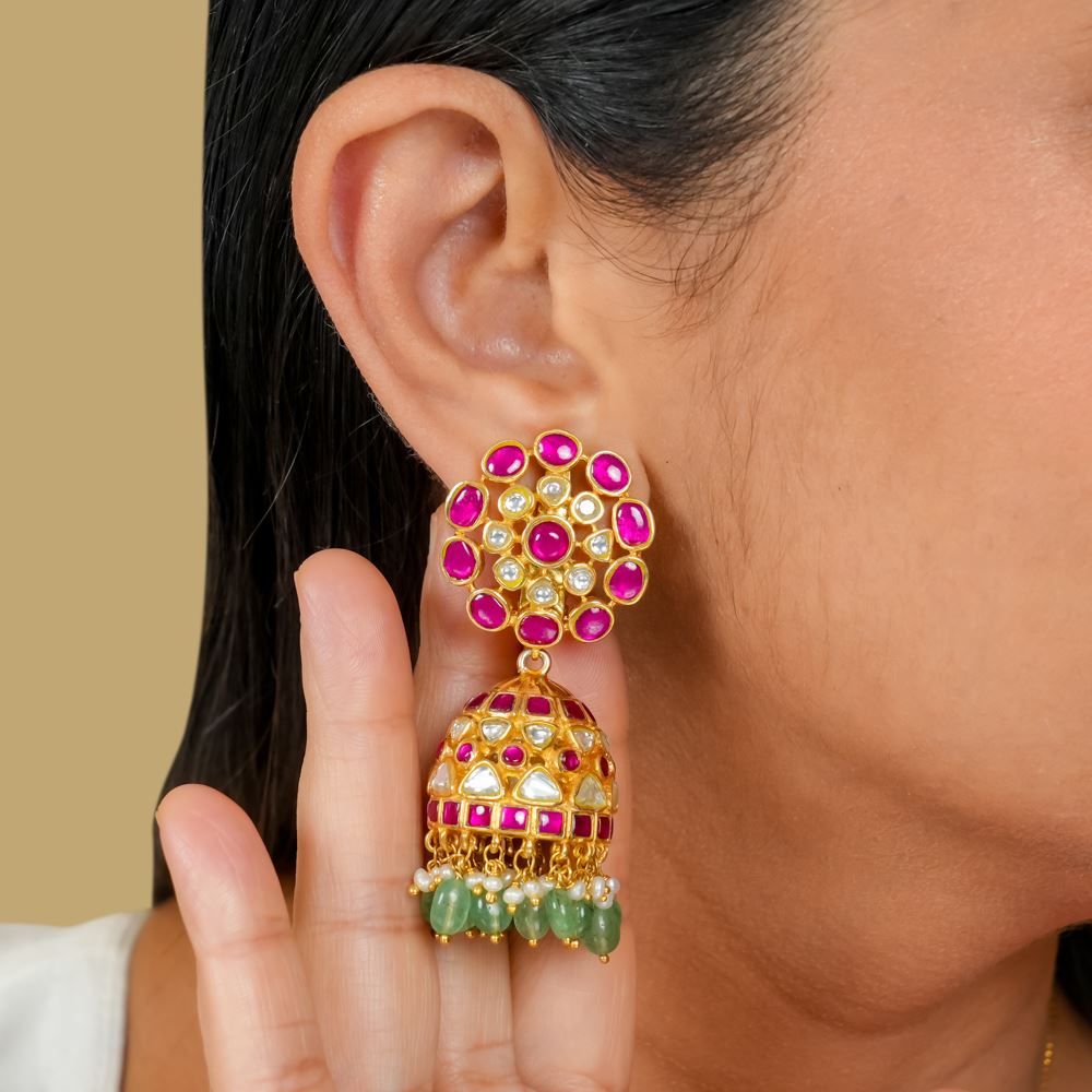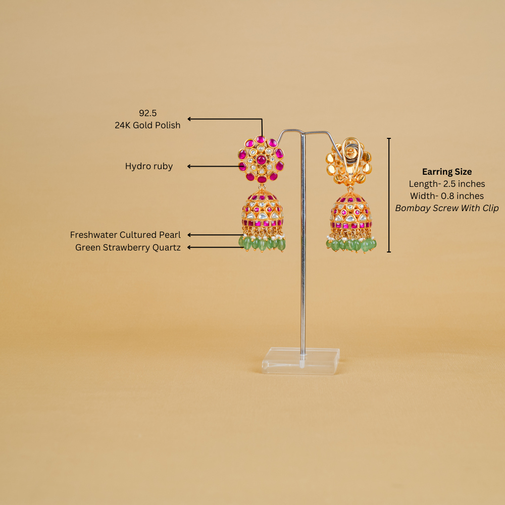 This earring is an elegant personification of Kundan. The artisans have put tremendous effort into creating this timeless allure, which is perfect for matching with your contemporary wear. Elegant blend of Freshwater Cultured Pearl ,Green Strawberry Quartz and Red Kundan .
